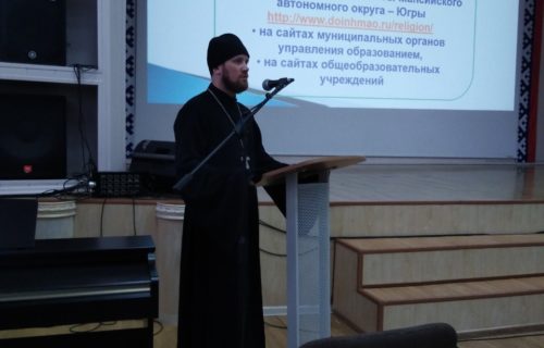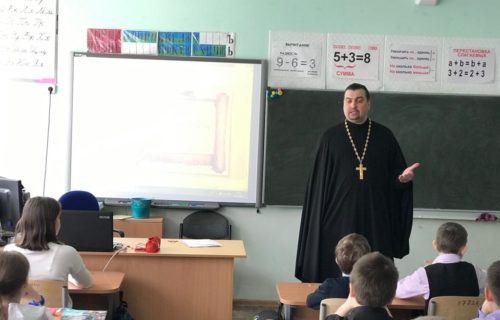 В преддверии Дня Победы священник храма в честь иконы Божией Матери «Всех скорбящих Радость» г. Сургута провел урок «Святые защитники Руси» в общеобразовательной школе № 6.