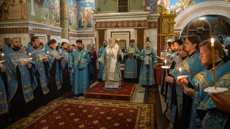 В канун дня памяти иконы Божией Матери именуемой «Отрада и Утешение» совершил всенощное бдение в Воскресенском кафедральном соборе г. Ханты-Мансийска