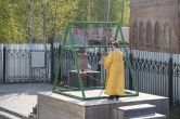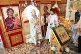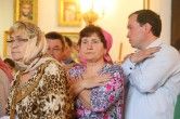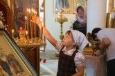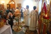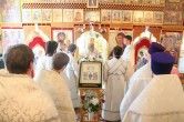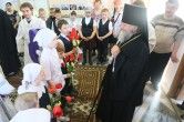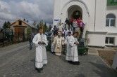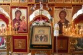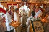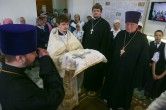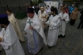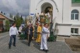 - После литургии состоялся крестный ход вокруг здания воскресной школы, в которой сейчас располагается храм. Представители власти несли запрестольные крест и икону.