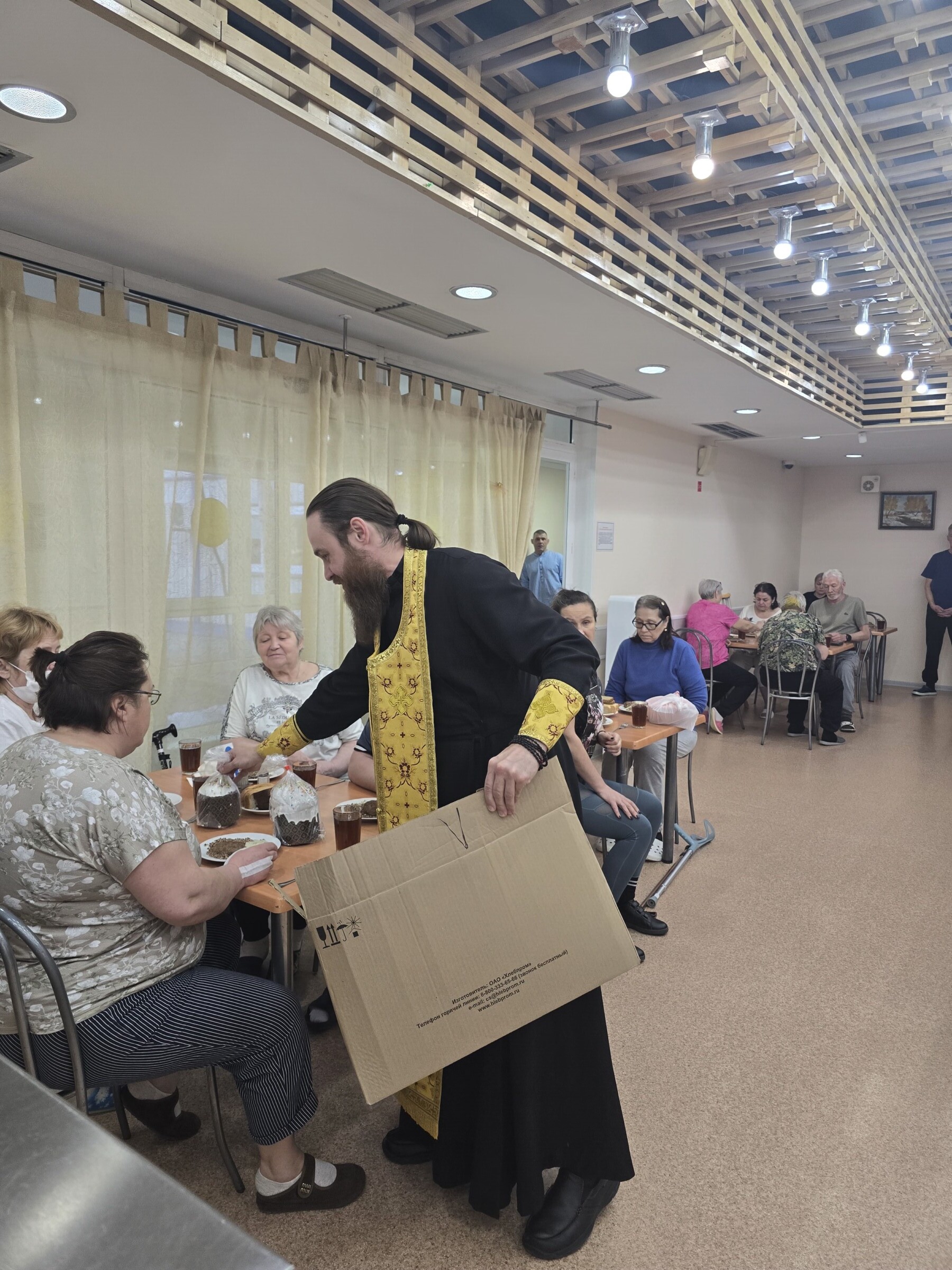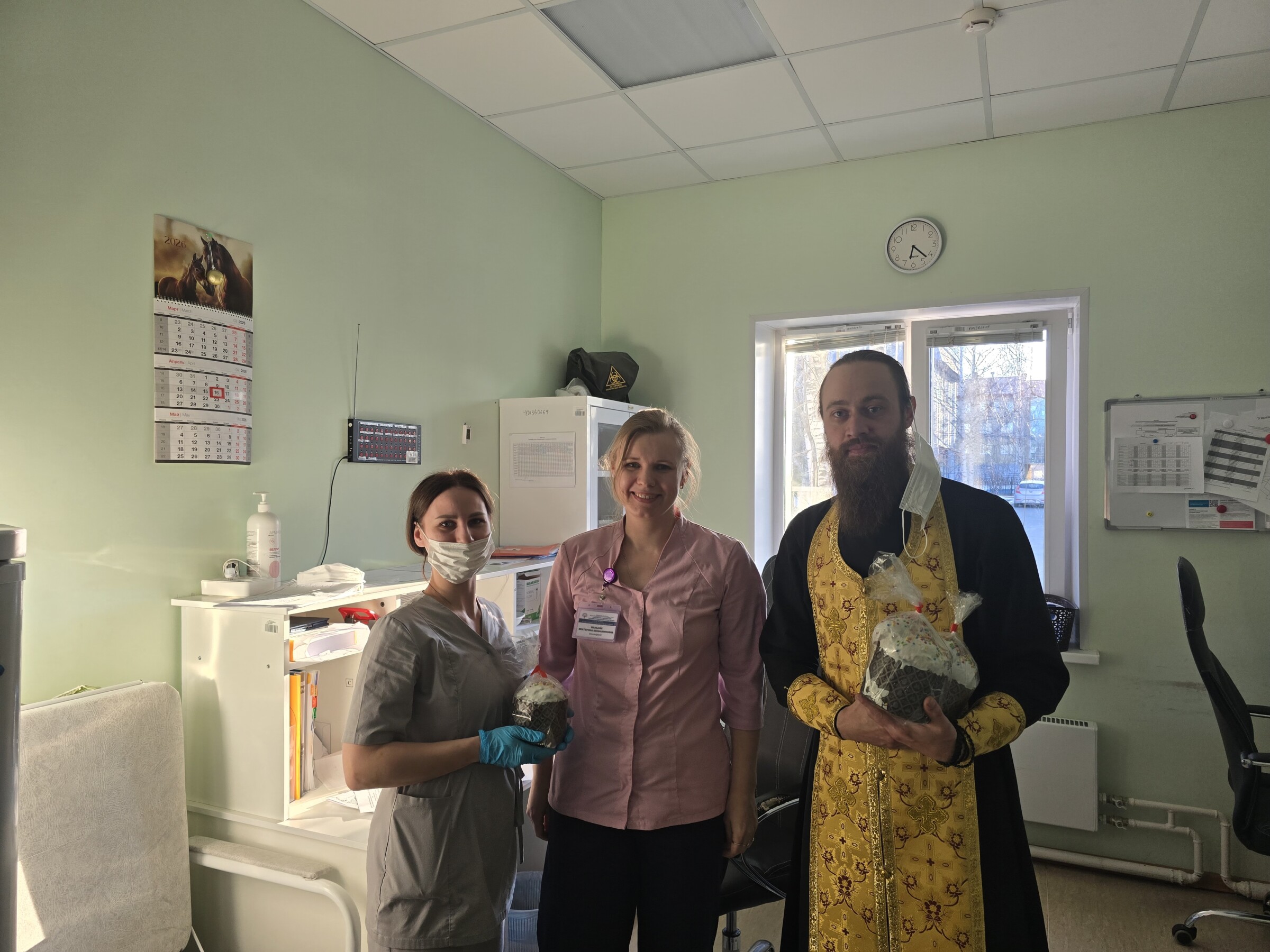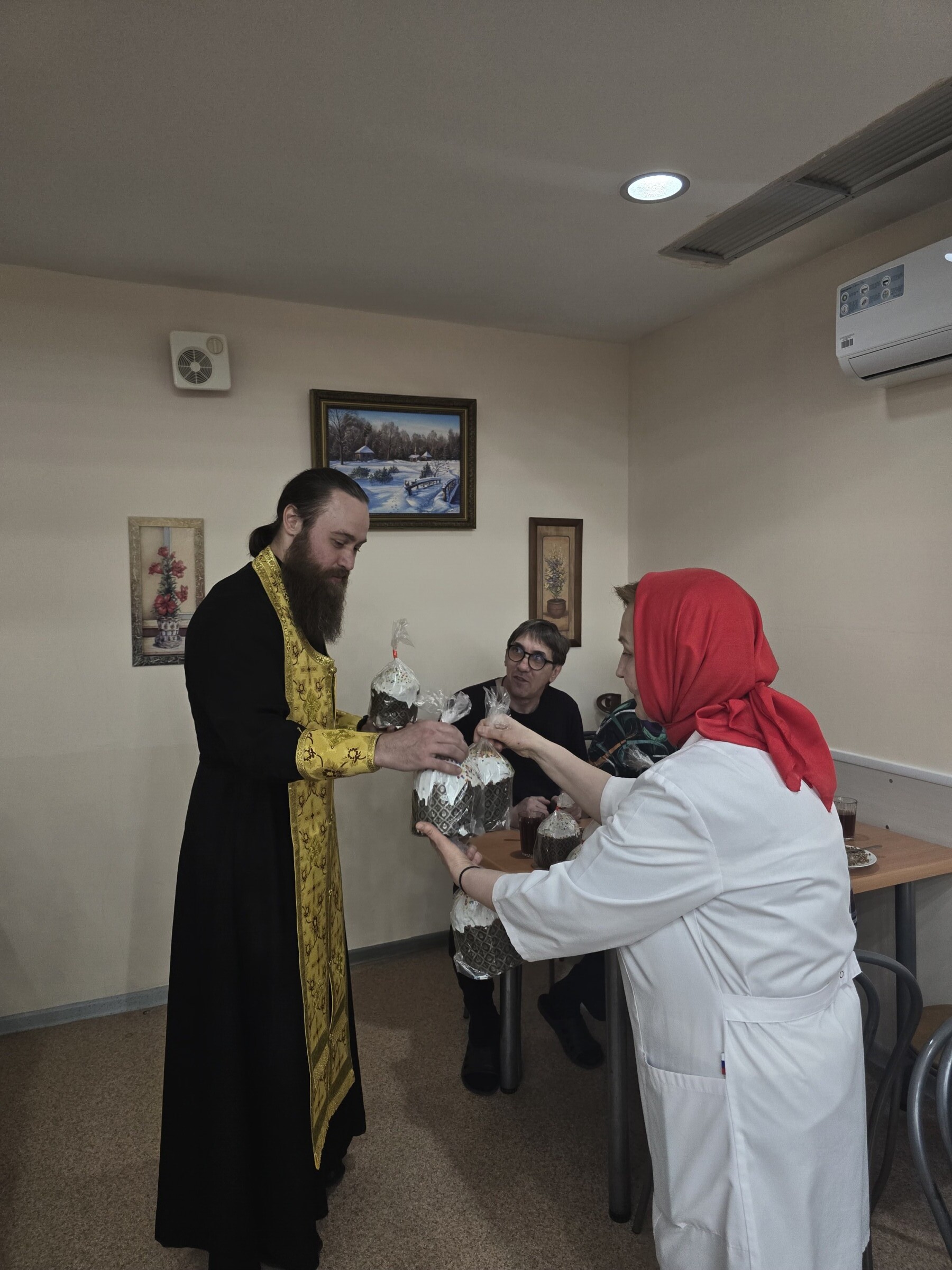 В рамках акции священник передал пациентам традиционные пасхальные угощения – освященные куличи, которые стали символом праздничной радости и заботы.