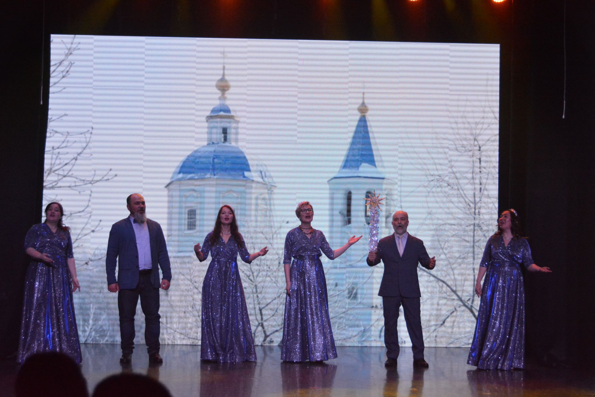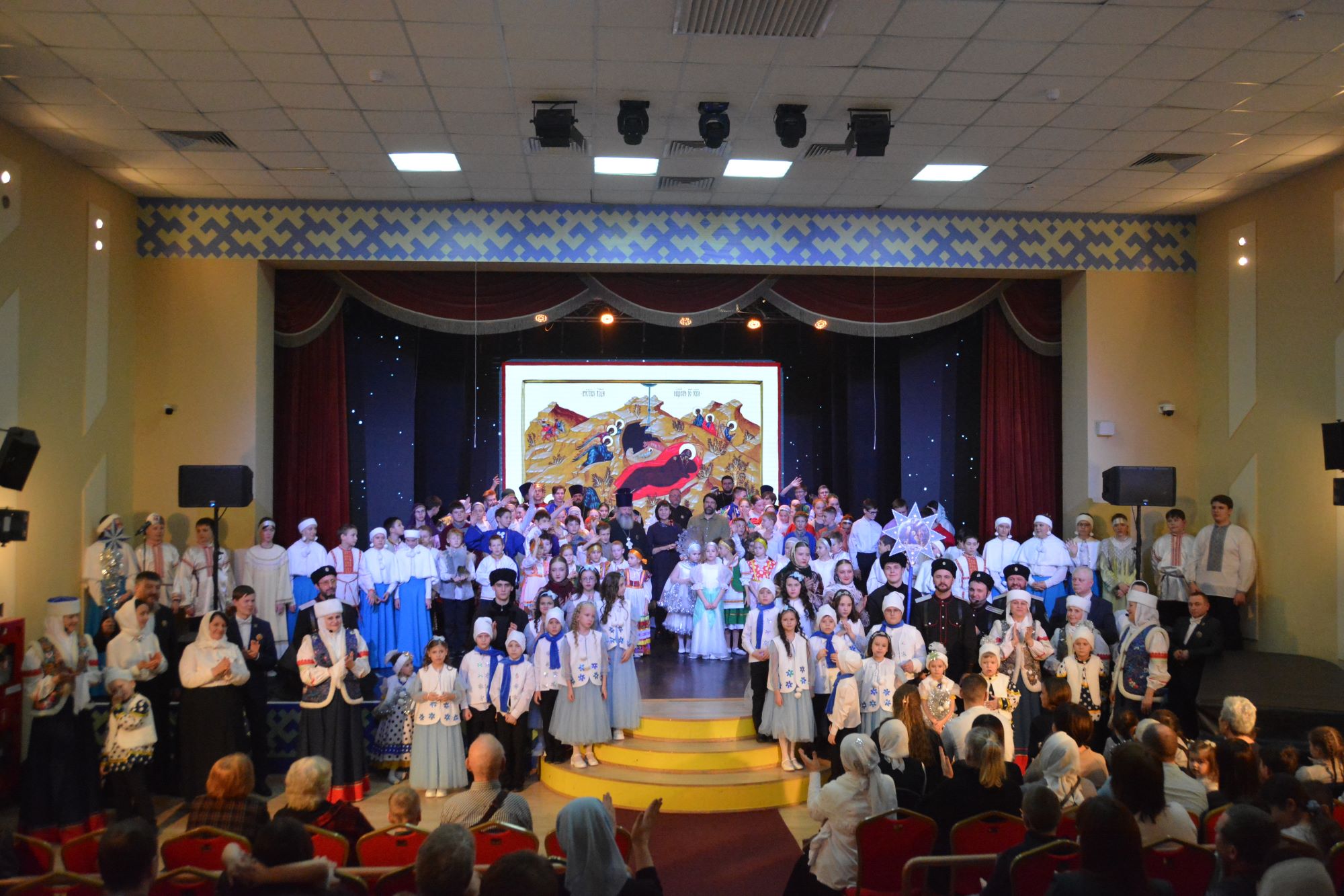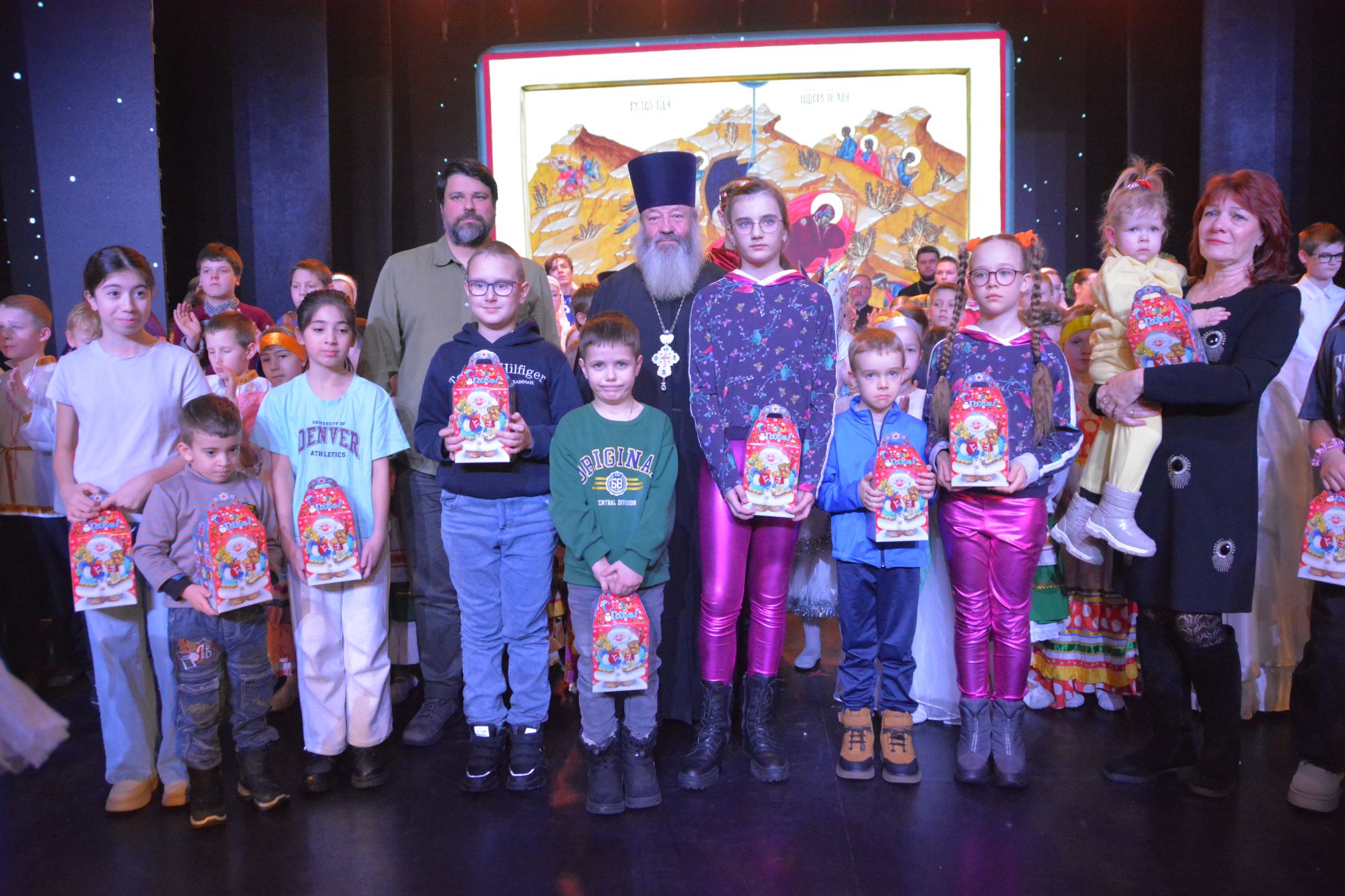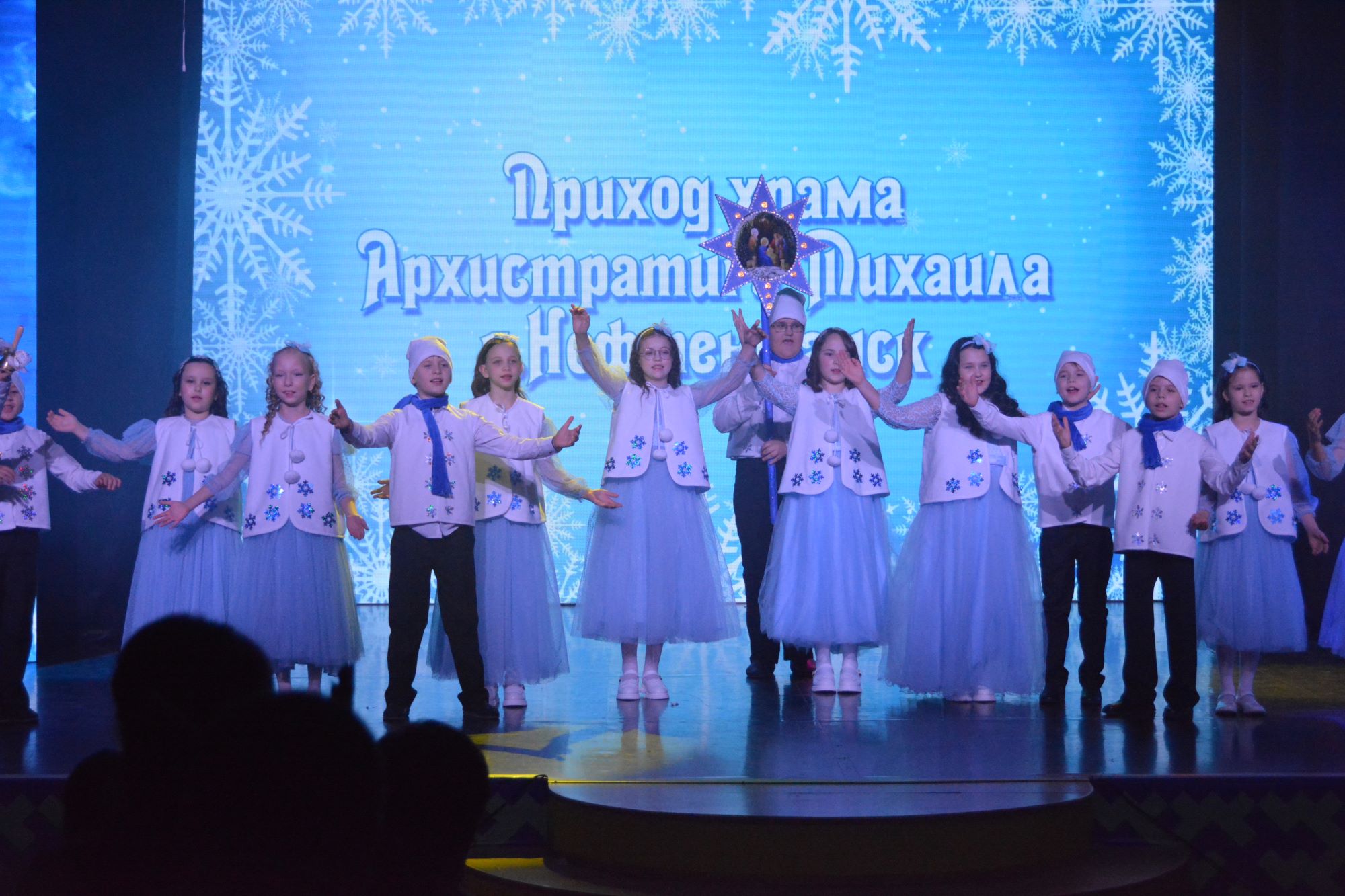 7 и 8 января 2026 года в КЦ «Юность» состоялось большое Рождественское поздравление для жителей города Нефтеюганска, подготовленное педагогами и учащимися Нефтеюганской православной гимназии, Воскресных школ прихода храма Святого Духа, прихода храма Архистратига Михаила. Весь ноябрь и декабрь творческие коллективы проводили репетиции и готовились к встрече Рождества Христова. Поздравление начиналось еще при входе в зрительный зал с пения колядок, фойе было красочно оформлено работами детей города — рисунками и поделками. В зрительном зале Культурного центра не было свободных мест. Интересную театральную постановку о Рождестве Господа и Бога нашего Иисуса Христа продолжила яркая концертная часть хоровых и танцевальных коллективов Нефтеюганской православной гимназии, прихода храма Святого Духа и прихода храма Архистратига Михаила. На праздничном мероприятии присутствовали заместители главы города Нефтеюганска Алексей Васильевич Монастырский, Николай Иванович Кондратьев, главный специалист Департамента образования и молодежной политики Боголюбова Ирина Николаевна. По окончании представления протоиерей Николай передал всем артистам и зрителям благословение от Митрополита Ханты-Мансийского и Сургутского Павла. По благословению Владыки Павла протоиерей Николай и Кондратьев Николай Иванович вручили приглашенным на концерт детям участников специальной военной операции рождественские подарки, а все выступающие на сцене христославы получили по шоколадке.