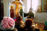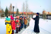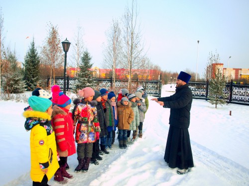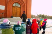 Иерей Спамбетов Николай рассказал детям об особенностях архитектуры храма, а также о его внутреннем устройстве. Указал на важность соблюдения правил поведения в храме, а также объяснил, что такое иконостас и как правильно молиться тому или иному святому.