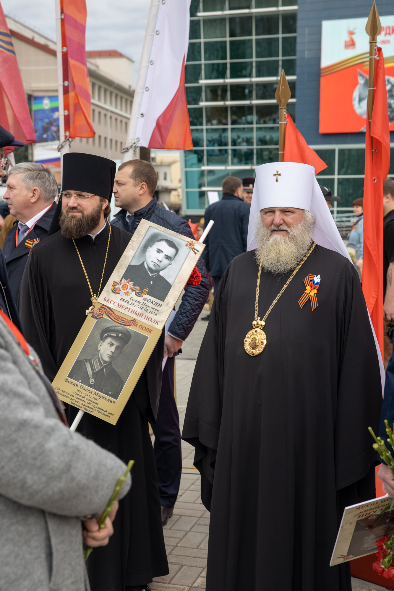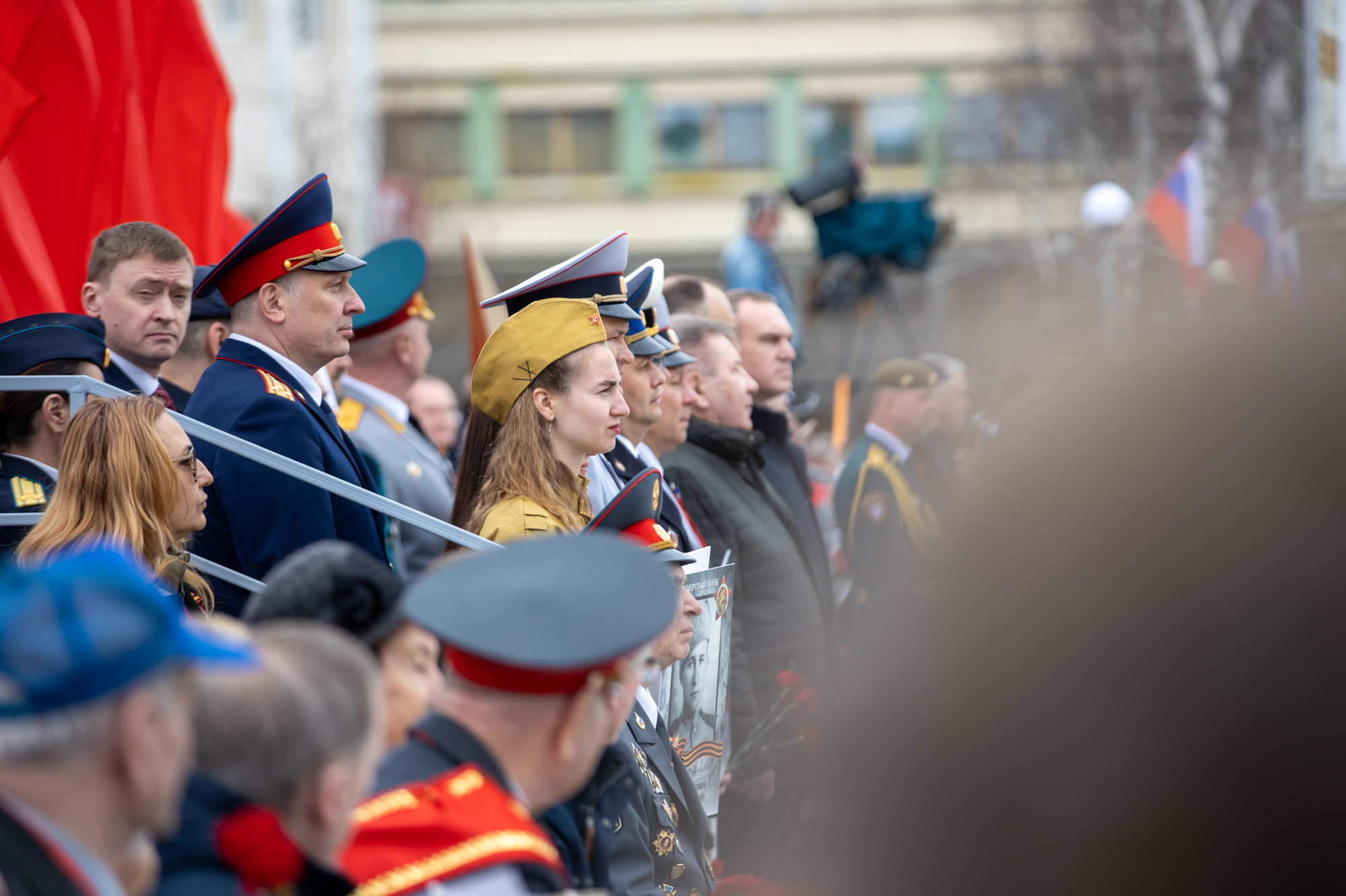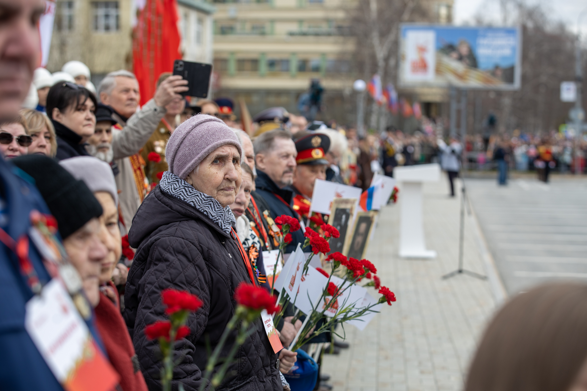 Вслед за парадом на главную городскую улицу вышла колонна «Бессмертного полка» с фотографиями солдат Великой Отечественной войны.