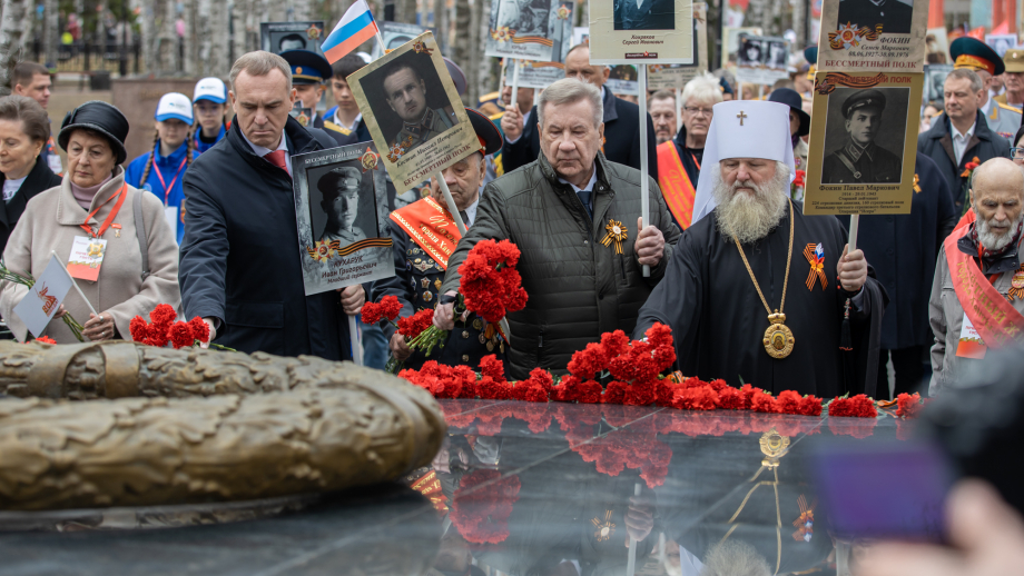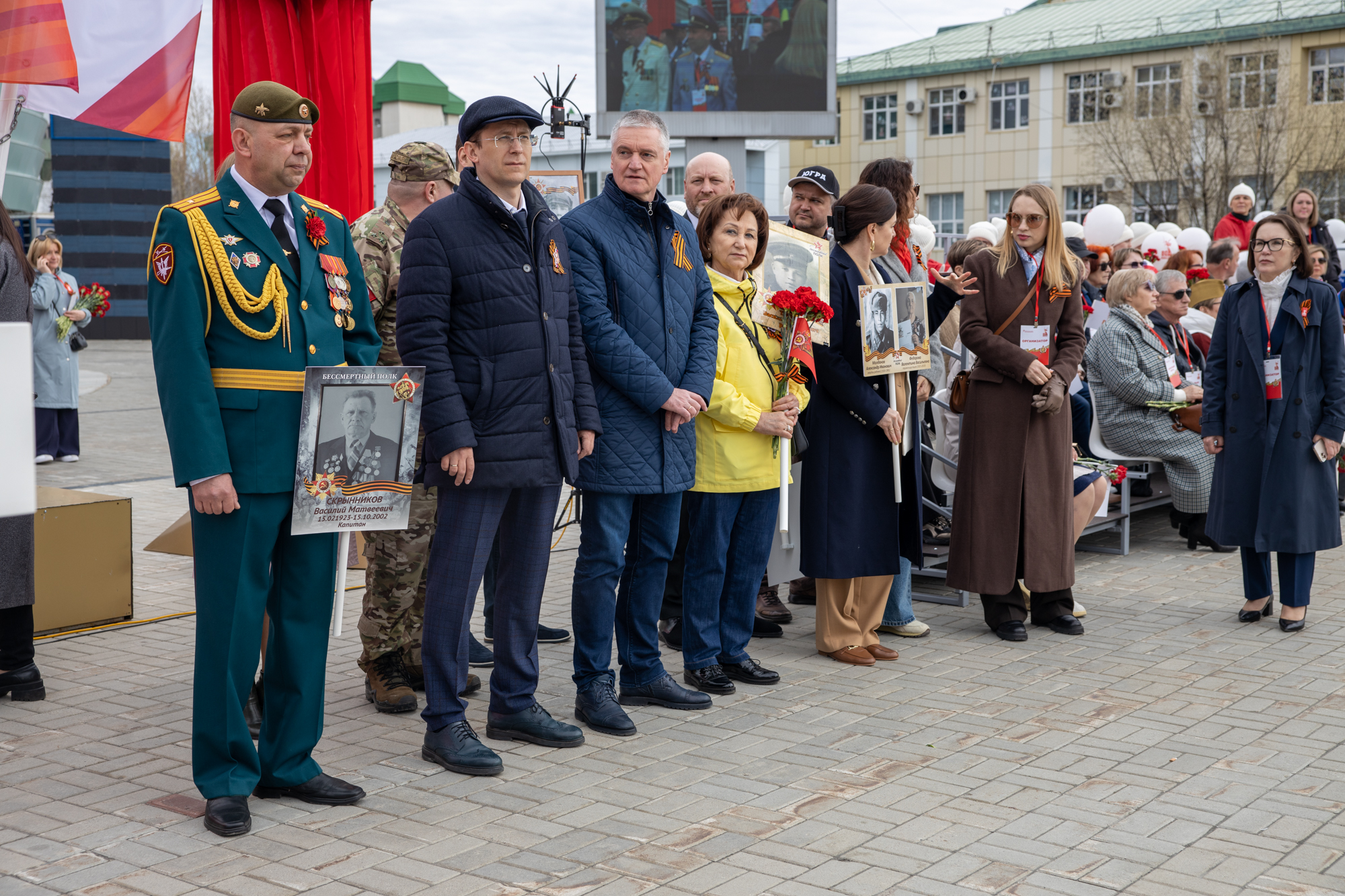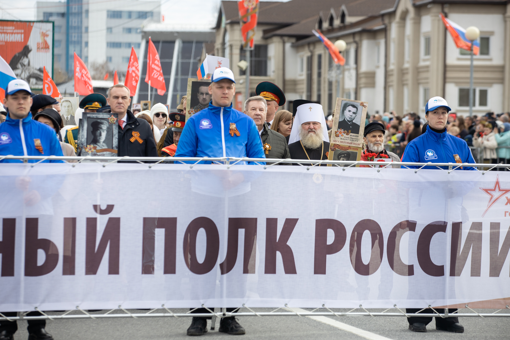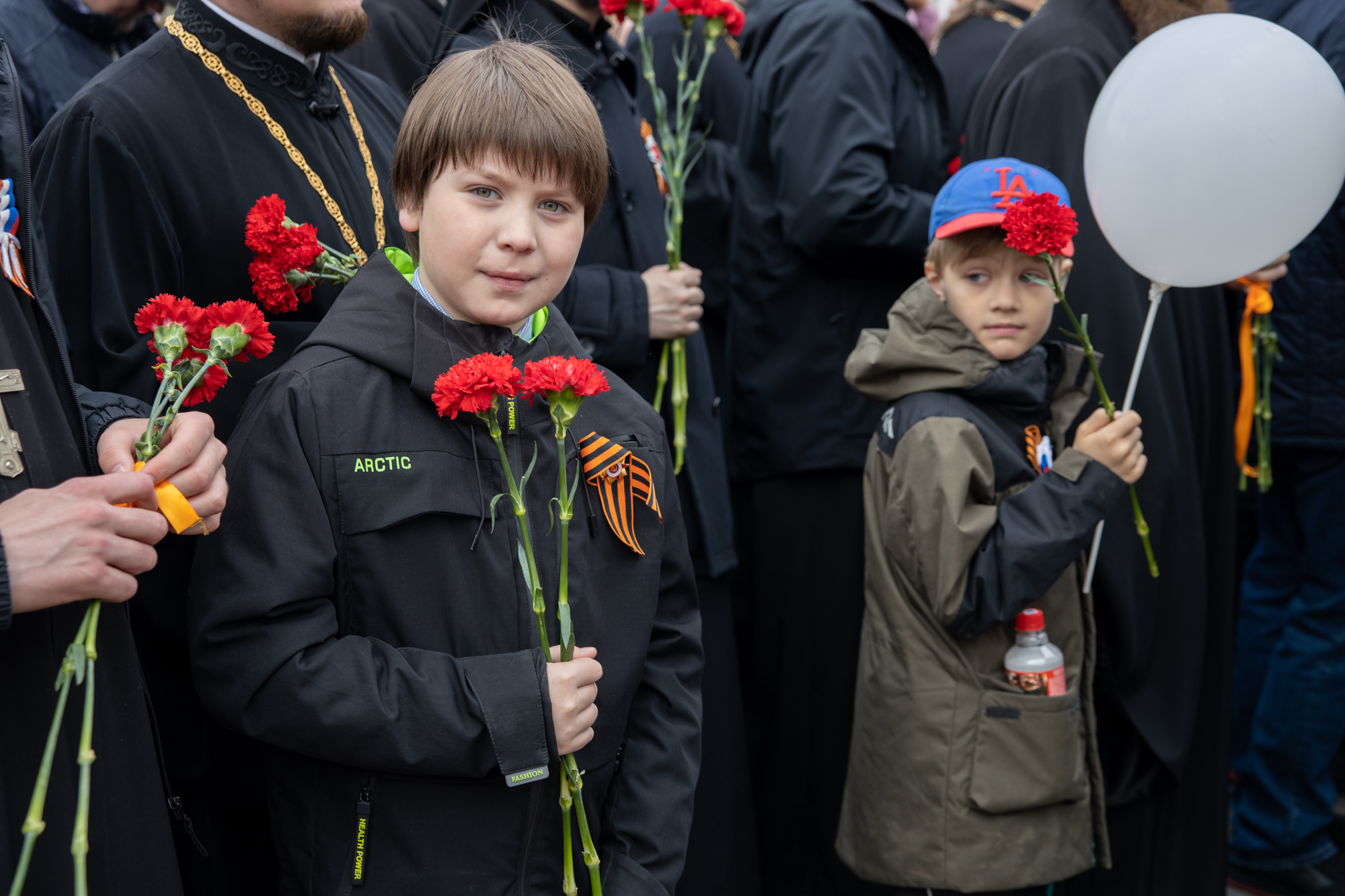 Вслед за парадом на главную городскую улицу вышла колонна «Бессмертного полка» с фотографиями солдат Великой Отечественной войны.