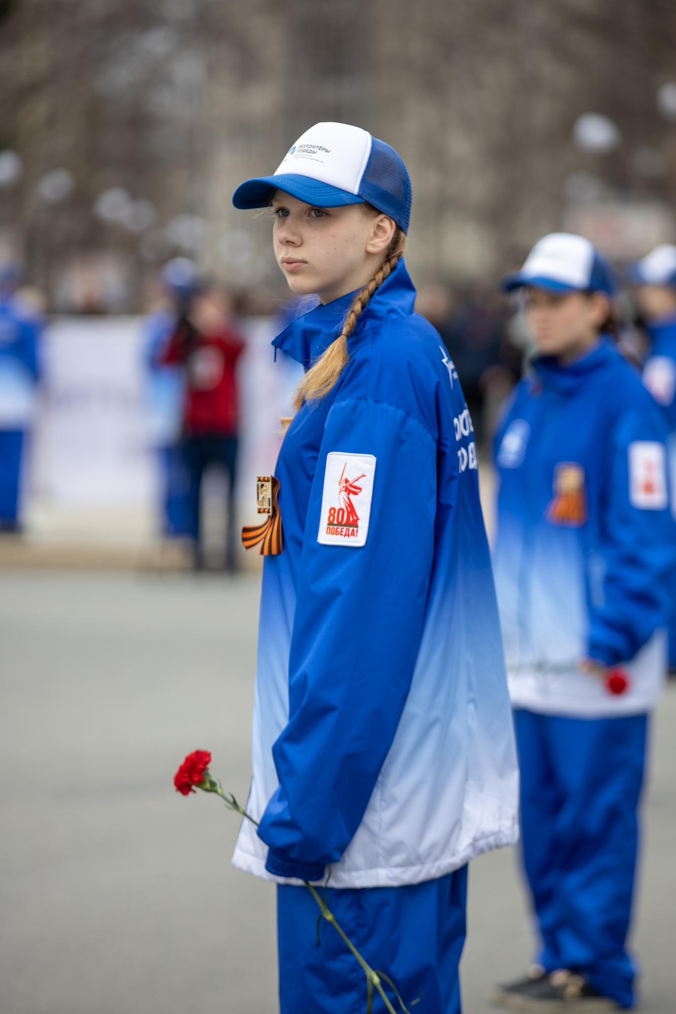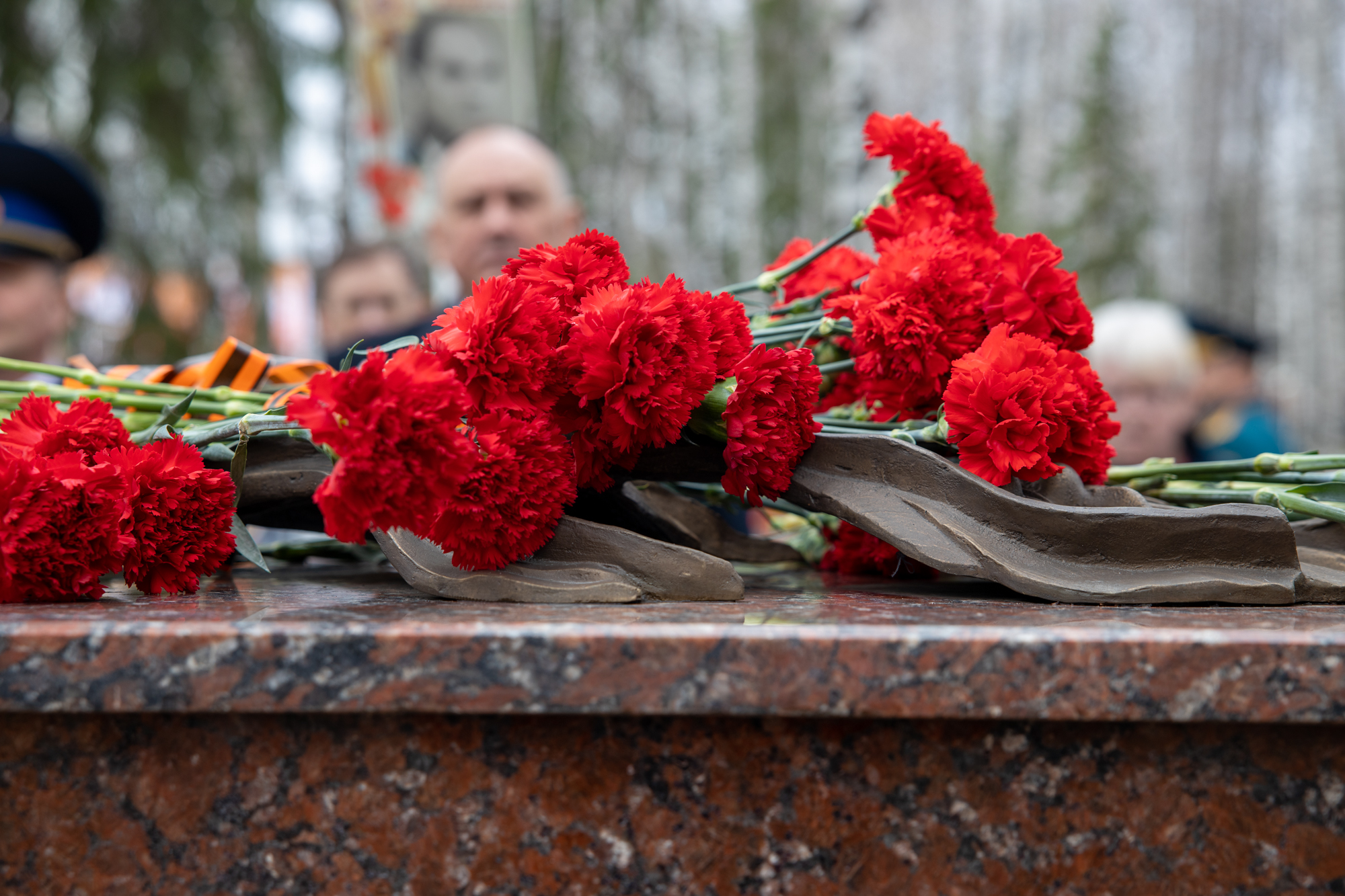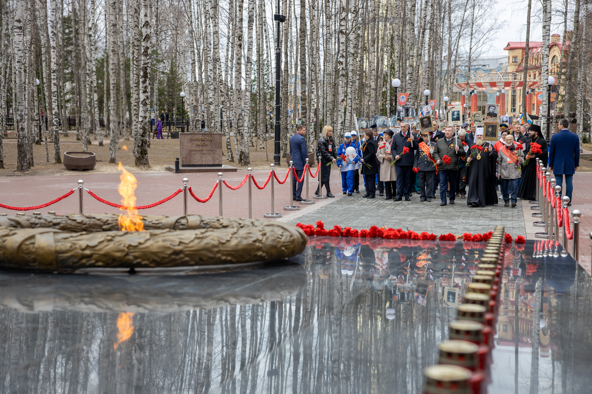 Все участники торжественного шествия возложили цветы к вечному огню в городском парке Победы.