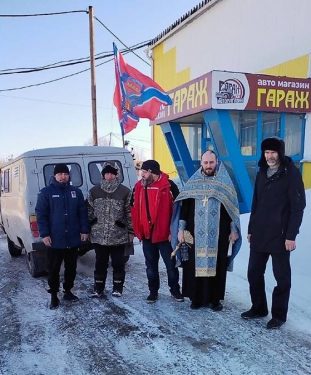 Прежде чем отправиться в долгий и опасный путь, добровольцев из числа Прихода благословилиерей Артемий Шумбасов и окропил святой водой машины с гуманитарным грузом. Также отец Артемий передал иконы для воинов, которые были собраны прихожанами храма в честь Сретения Господня.