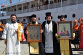 От причала, где их встречали благочинный Ханты-Мансийского благочиния, протоиерей Сергий Кравцов с прихожанами, участники экспедиции прошли Крестным ходом к храму Покрова Пресвятой Богородицы. Здесь отец Сергий в сослужении прибывшего духовенства совершили заупокойную литию. В центре на аналоях были установлены для поклонения прибывшие из Тобольска со «Славянским ходом» святыни — Абалацкая икона Божией Матери, иконы святителя Иоанна и священномученика Гермогена Тобольского с частицами их мощей.