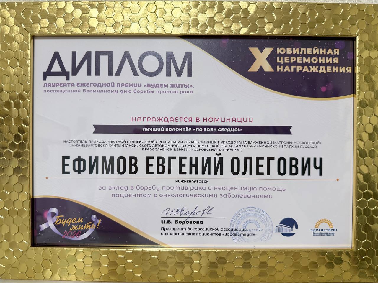 Иерей Евгений Ефимов, настоятель прихода храма Блаженной Матроны г. Нижневартовска лауреатом премии  в номинации Лучший волонтёр «По зову сердца!»