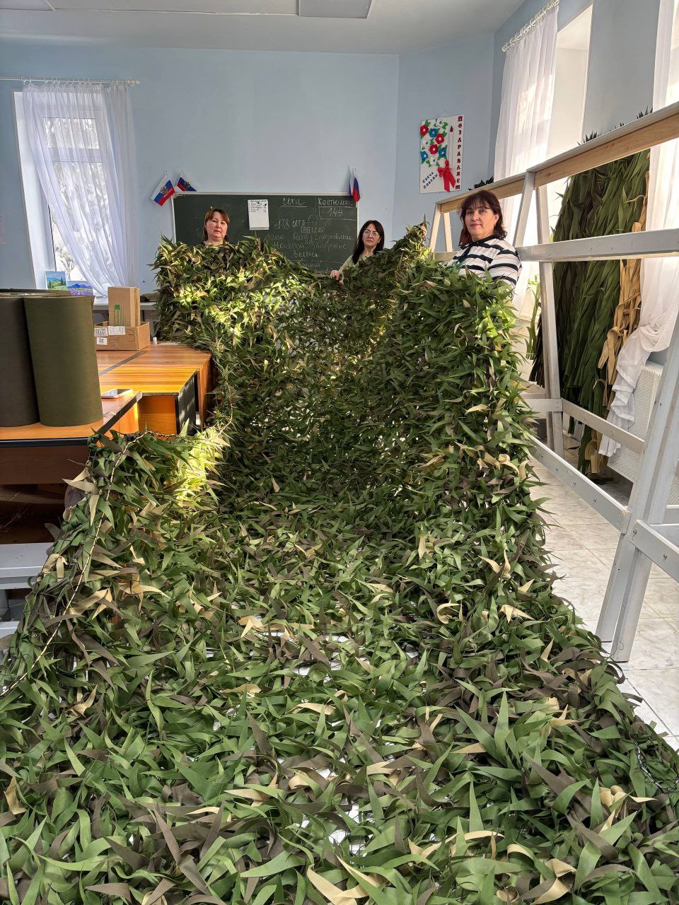 • Изготовлено:маскировочные сети (3 шт. 6×4 м и 6 шт. 3×4 м), маскировочные костюмы — 7 шт., отшиты госпитальные трусы для лежачих больных, сплетены браслеты спасения.