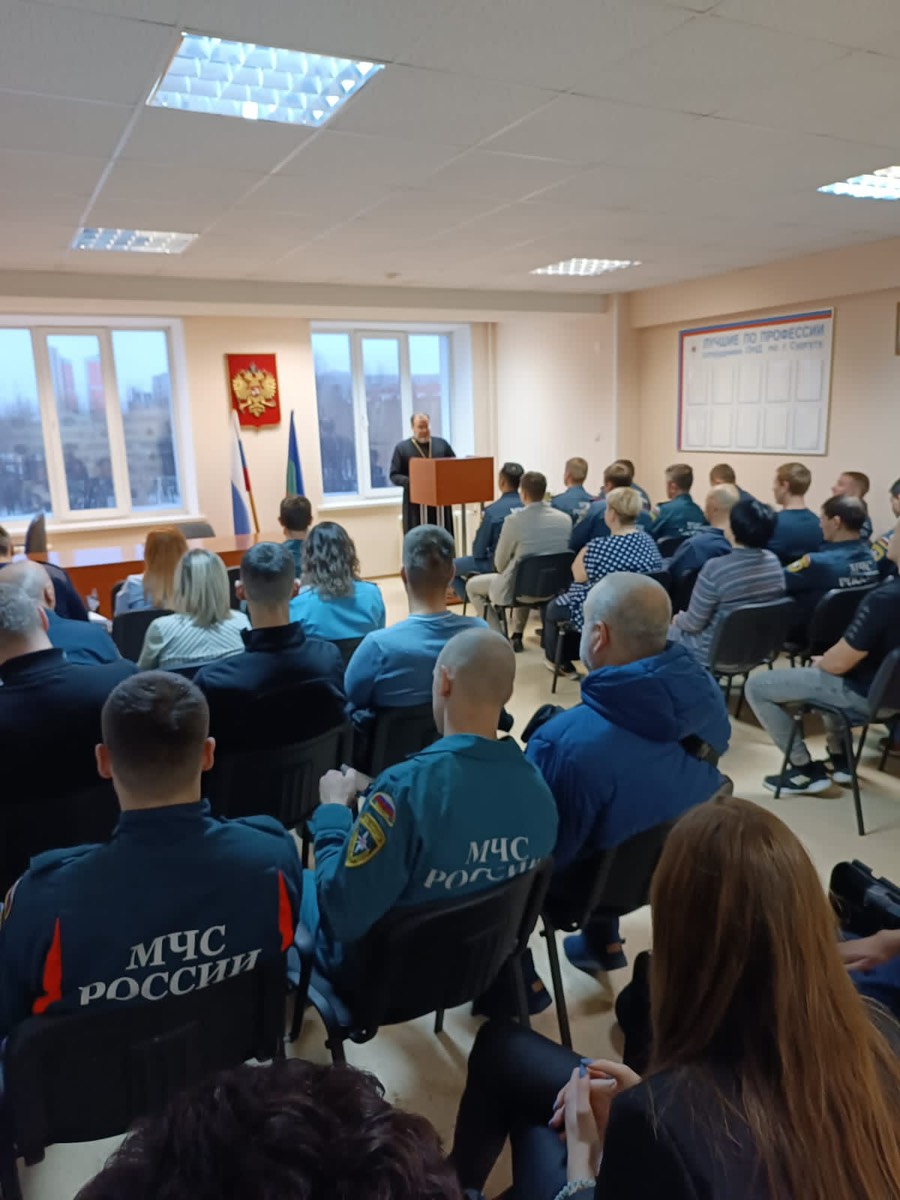 15 ноября 2023 года Клирик храма в честь святителя Николая Чудотворца г. Сургута протоиерей Николай Гамм провел беседу с сотрудниками МЧС пожарной части №118 г. Сургут на тему: «Важность сохранения мира в нашем мононациональном и многоконфессиональном государстве»
