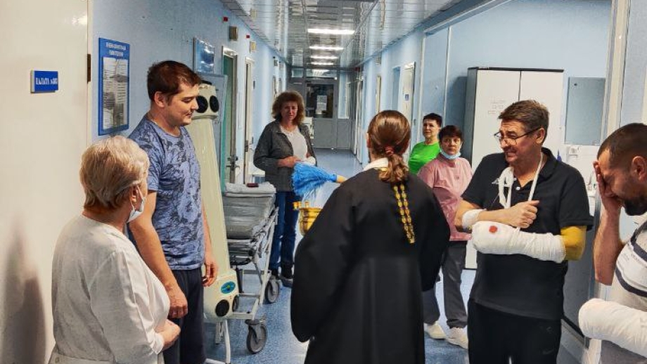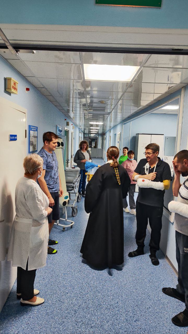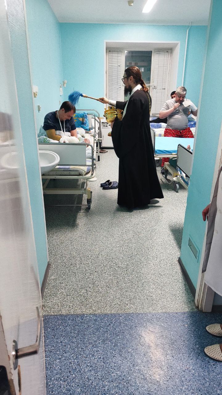 Настоятель храма ирей Николай Ведерников с сестрами милосердия окропил крещенской водой администрацию и отделения травматологической больницы.