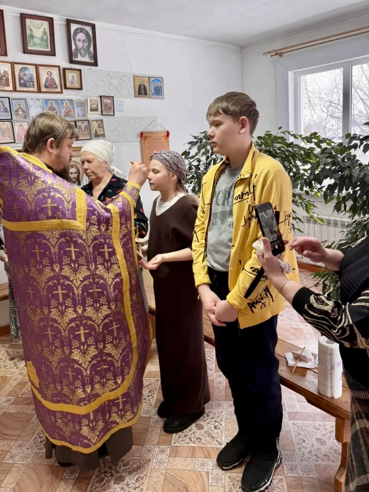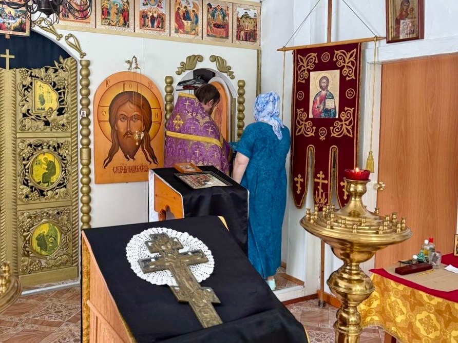 Богослужение прошло в храме иконы «Всех скорбящих Радость». Отец Леонид совершил Божественную литургию, а затем — Таинство Соборования (Елеосвящения).