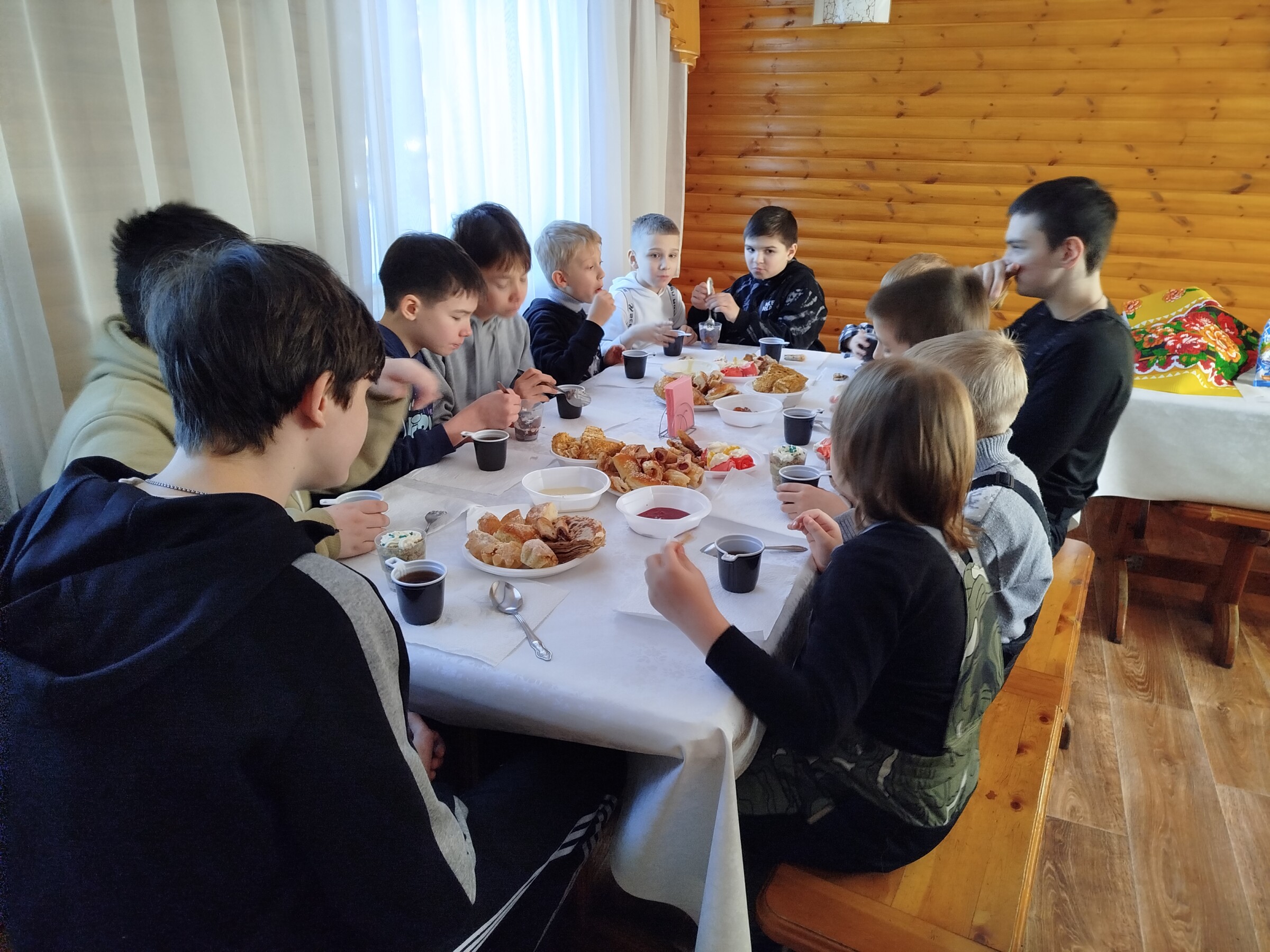После активных игр всех ждали вкусные блины с чаем и сладостями. Праздник прошёл в тёплой, душевной атмосфере. Участников было около 25 человек.
