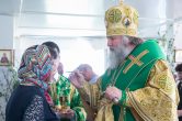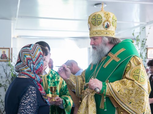 По окончании Богослужения митрополит Павел обратился к собравшимся: «Дорогие братья и сестры, позвольте от сердца, от души всех поздравить с величайшим праздником — днем Святой Троицы! Завтра православная церковь празднует день Святаго Духа. Мы все, переживая период от Вознесения до Троицы, когда уже не приветствуем друг друга возгласом «Христос Воскресе», когда опускается молитва «Царю небесный» в начале богослужения и молитвенного правила, ощущаем некую пустоту, которая восполняется в праздник Святой Троицы. Подобно апостолам, которым Христос по Вознесении обещал послать Утешителя — Духа Истины, сошедшего в виде огненных языков и при множественном шуме, мы сегодня принимаем Святаго Духа как восполняющий наши утраченные духовные и телесные силы, великий дар.