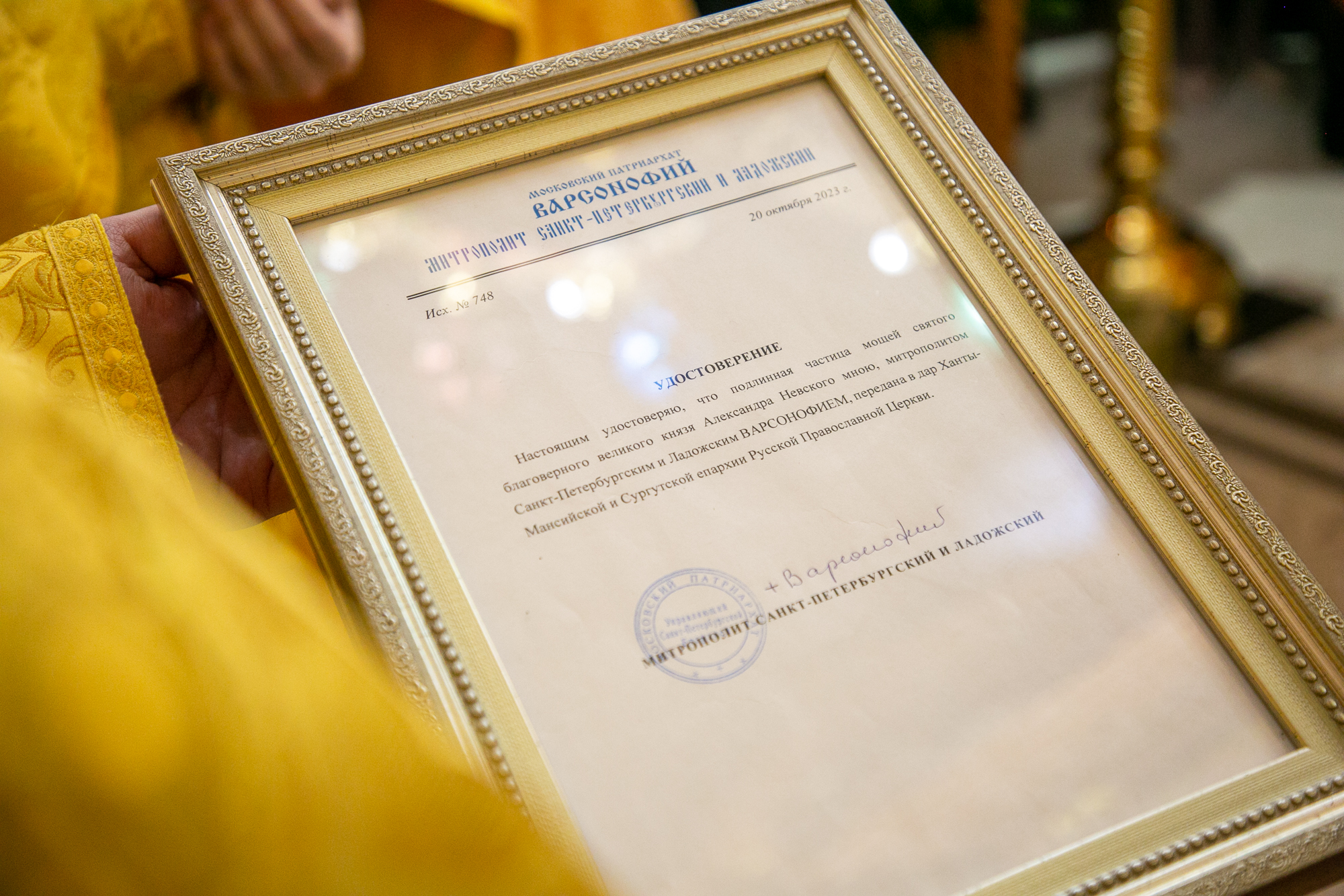 Хотел бы ещё раз сегодня всех сердечно поздравить с этим знаковым, замечательным событием и конечно же, вручить удостоверение, подтверждающее подлинность этих святых мощей. Храни всех Господь, с праздником!»
