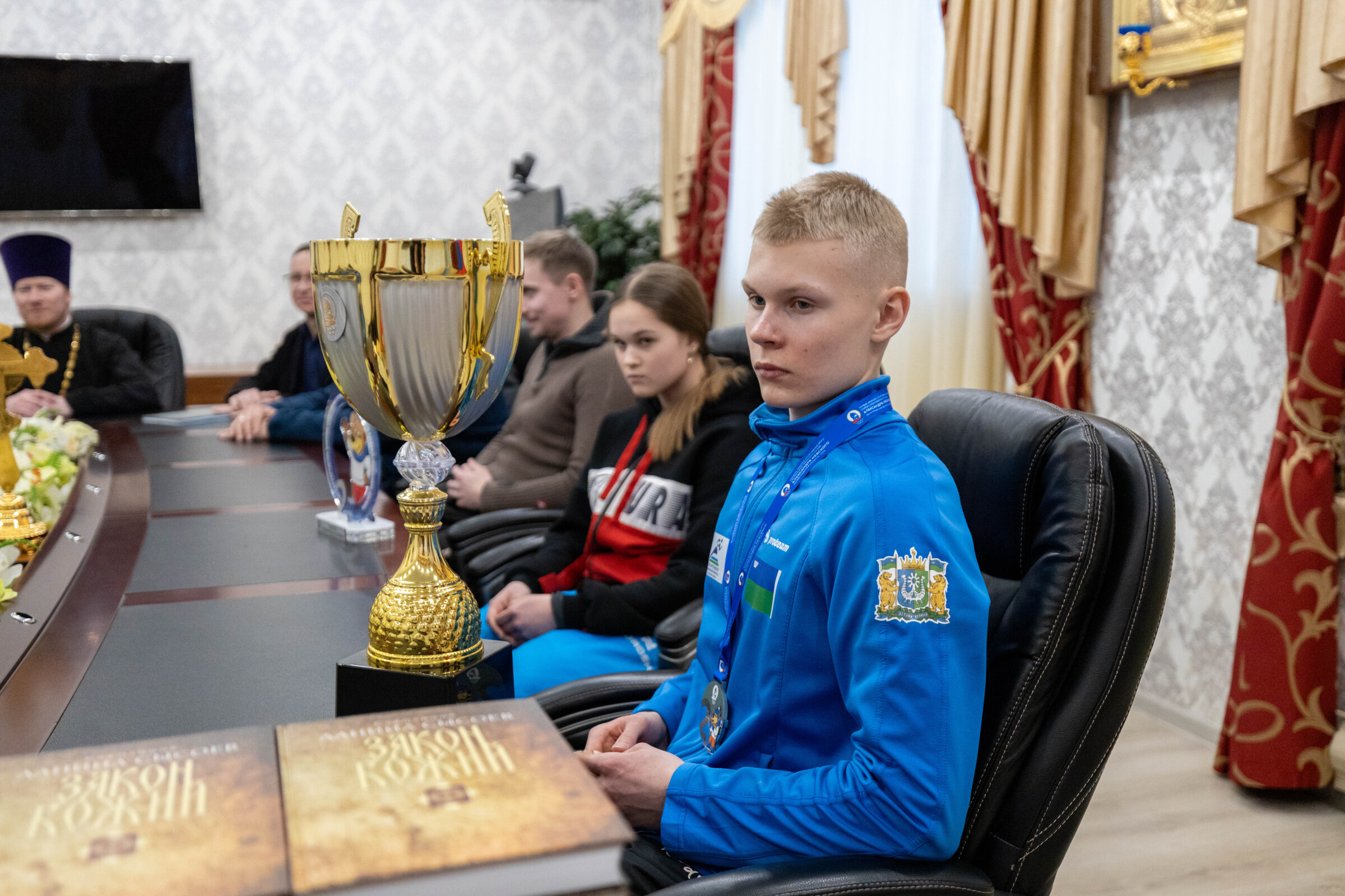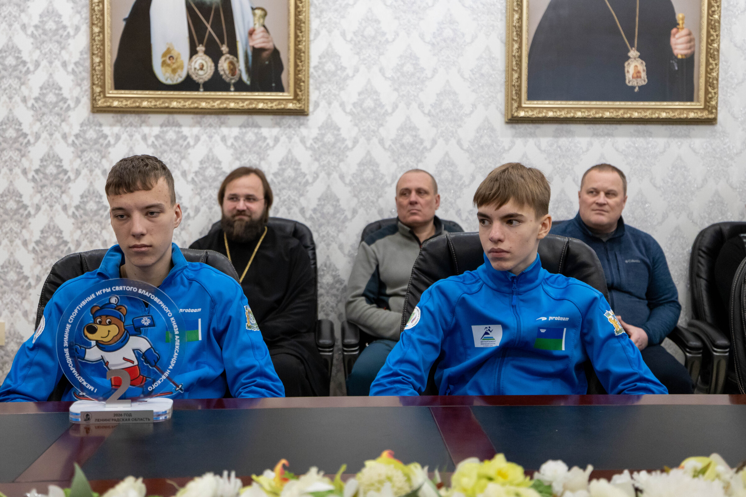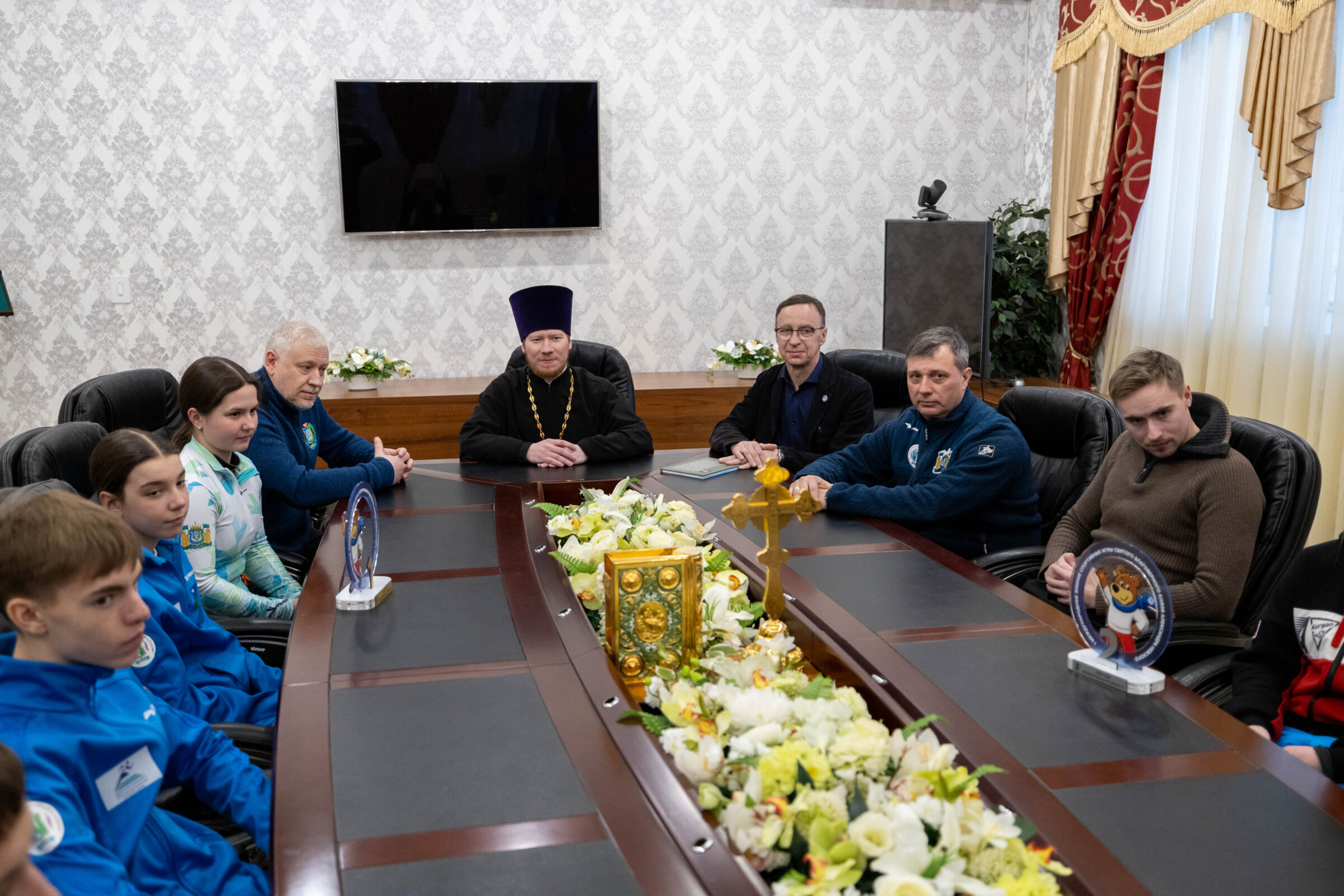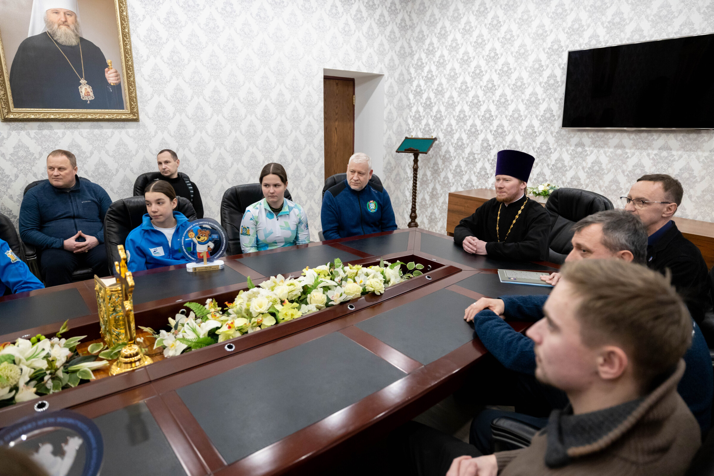 Во встрече приняли участие директор БУ ДО Спортивная школа олимпийского резерва г. Ханты-Мансийска Сергей Михайлович Крянин, секретарь Ханты-Мансийской епархии игумен Антоний (Кирпичев), председатель Отдела по делам молодежи, ответственный по вопросам физической культуры и спорта Ханты-Мансийской епархии иерей Евгений Набоков, старший тренер по резерву ХМАО-Югры, БУ Центр спортивной подготовки сборных команд Югры Александр Владимирович Корчак, тренер-преподаватель БУ ДО Спортивная школа олимпийского резерва г. Ханты-Мансийска Игорь Николаевич Корнев, тренер-преподаватель «БУ ДО Спортивная школа олимпийского резерва» г. Ханты-Мансийска Артем Андреевич Мотошин, а также биатлонисты, воспитанники «БУ ДО Спортивная школа олимпийского резерва» г. Ханты-Мансийска, занявшие призовые места на Международных спортивных играх святого благоверного князя Александра Невского: Всеволод Рассказов (II место среди юношей 13-14 лет в спринтерской гонке по биатлону на 4,5 км), Дмитрий Астафьев, Дмитрий Воронцов, Виктория Корюкина, Варвара Сергеева, Алиса Янкович.