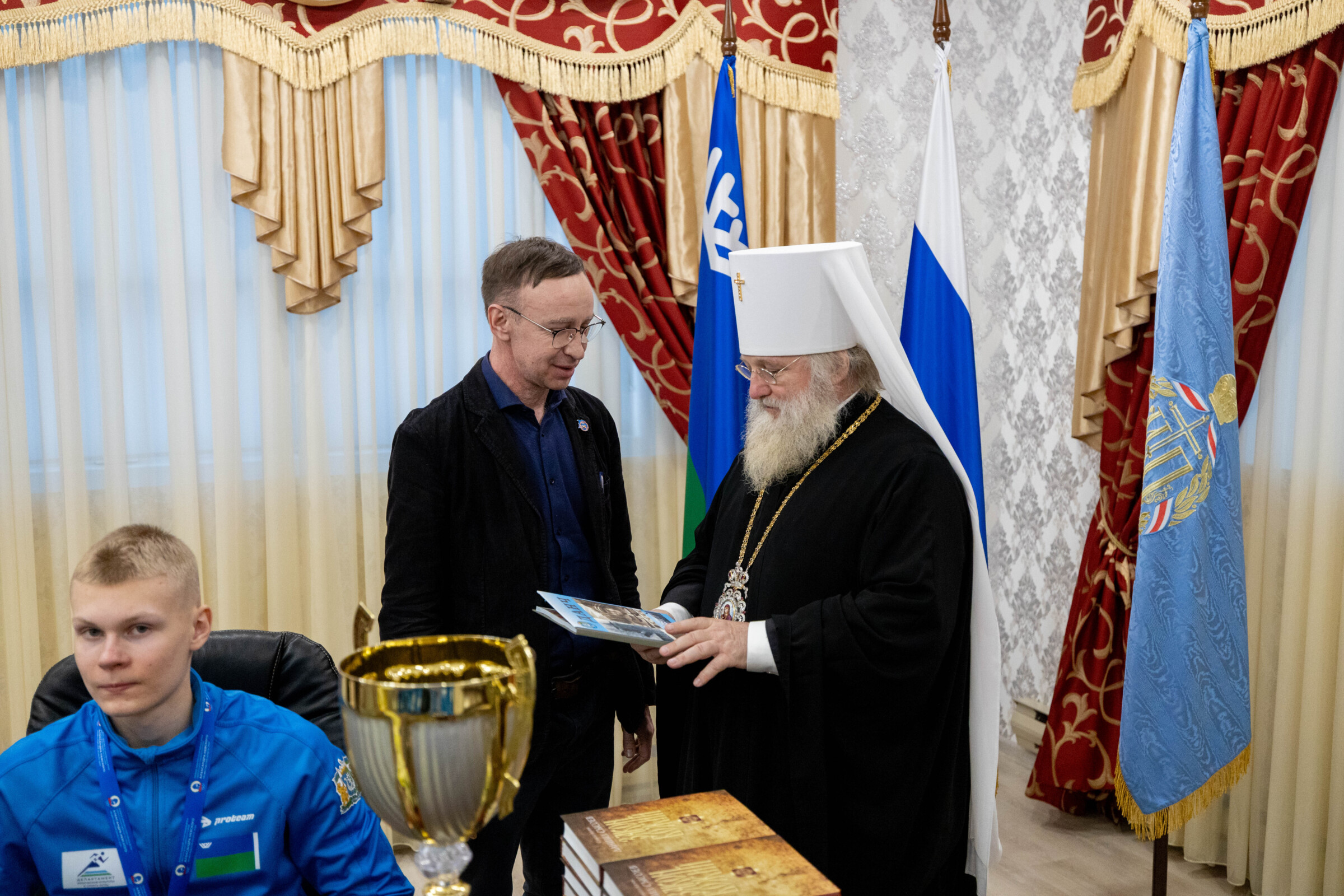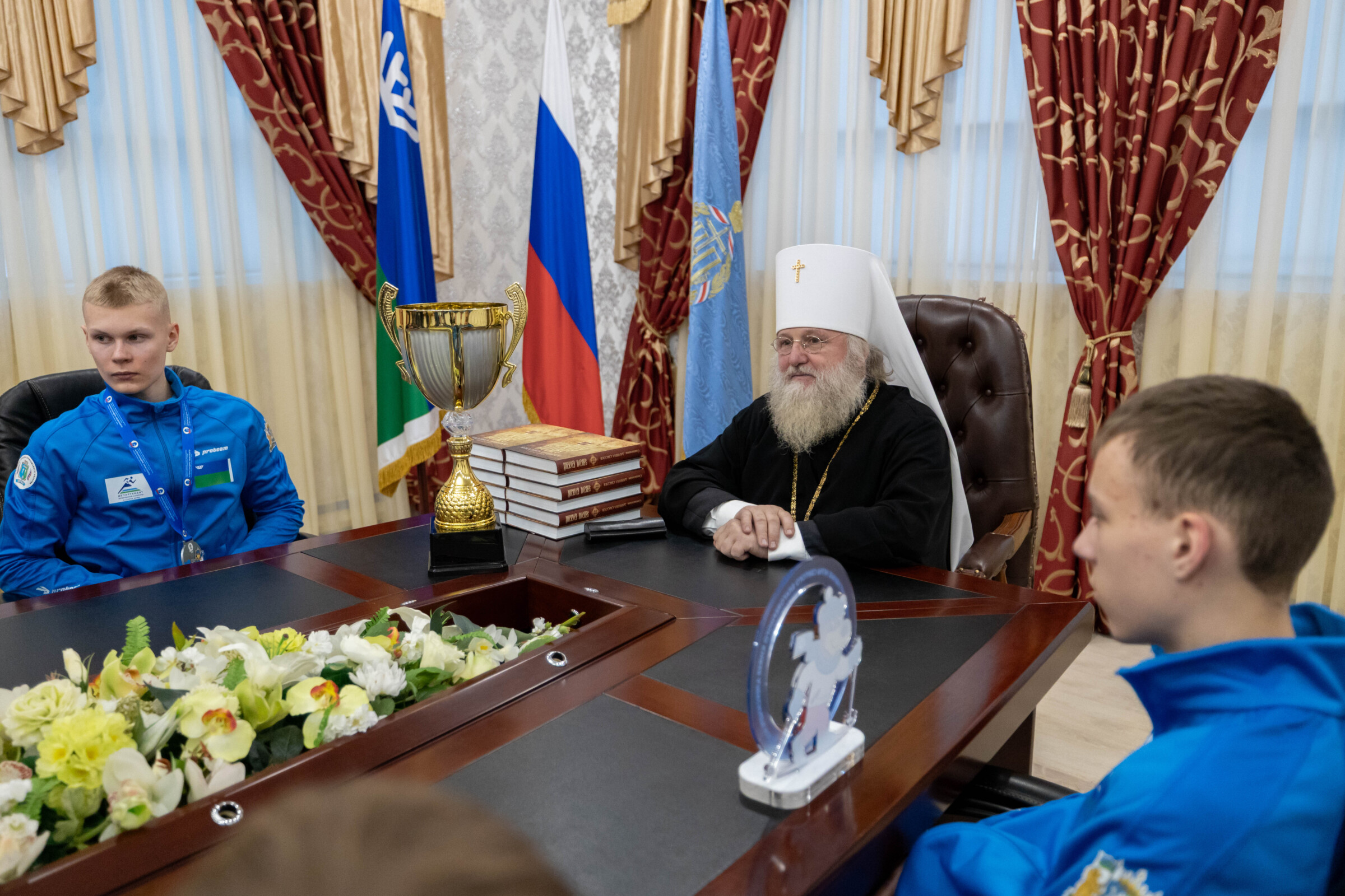 «Я очень рад поприветствовать вас всех в епархиальном управлении и очень рад тому, что наша команда заняла первое место. Это для нас очень почетно. Тем более, что в Ленинградской области я не один раз служил, и в Ленинграде жил 13 лет, мне эти места все очень близки, знакомы. И владыка Варсонофий, и владыка Вениамин, и владыка Мстислав, который служил там вместе с вами за Божественной литургией. Очень приятно, что Ханты-Мансийск, территориально очень далёкий от Северной столицы, занял первое место. Молодцы! Поздравляю вас и благожелаю, чтобы милость Божия содействовала и сопутствовала всем вам! Чтобы мы всегда держали первые места, были флагманами всех наших соревнований и на спортивном поприще, и на других направлениях. Просто приятно, что у нас хорошие школы, хорошие дети, которые завоевывают первые места. Это на самом деле и престижно, и отрадно и для округа, и для школ наших, и для митрополии в целом!»