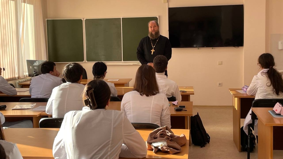 В рамках занятий по учебной дисциплине «Основы российской государственности» с понедельника по пятницу священники рассказывают будущим врачам о традиционных духовно-нравственных ценностях нашей страны, выразителями которых являются православное христианство и другие традиционные религии, знакомят ребят с христианским взглядом на медицину как на служение милосердия и на человеческое здоровье как на дар Божий.