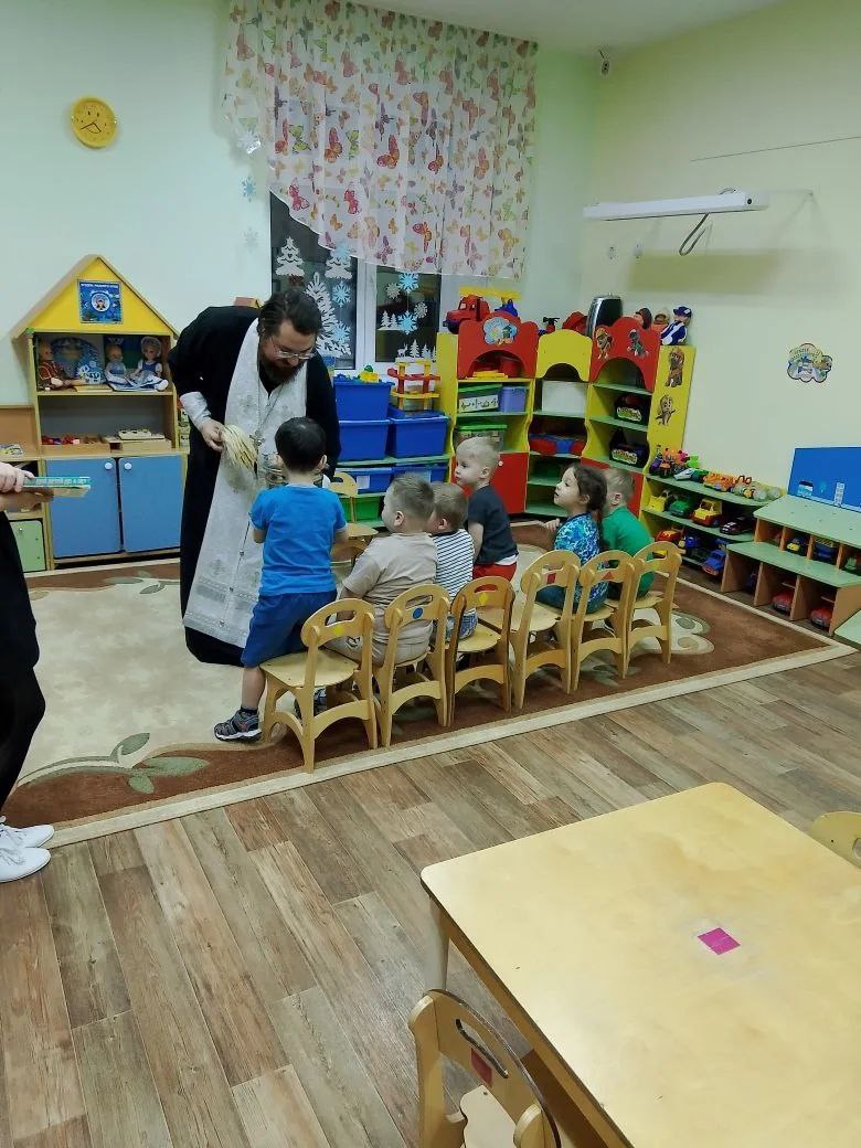 Во второй половине дня отец Иоанн совершил освящение здания детского сада. Входе встречи с воспитанниками сада, отец Иоанн рассказал детям и воспитателям о празднике Крещения Господня.