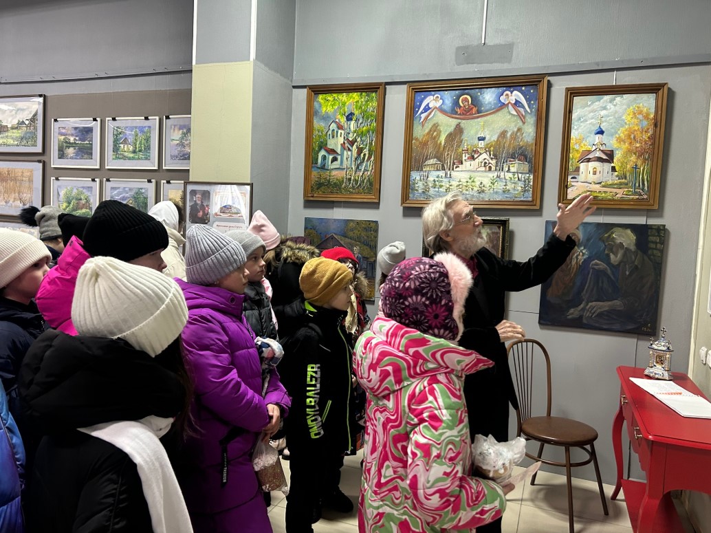 По окончании беседы, дети задавали вопросы священнику. Батюшка окропил святой водой присутствующих и от Прихода ребятам были вручены подарки — пасхальные куличи и праздничные закладки. После посещения храма ребята побывали на выставке картин А.В. Груздева.