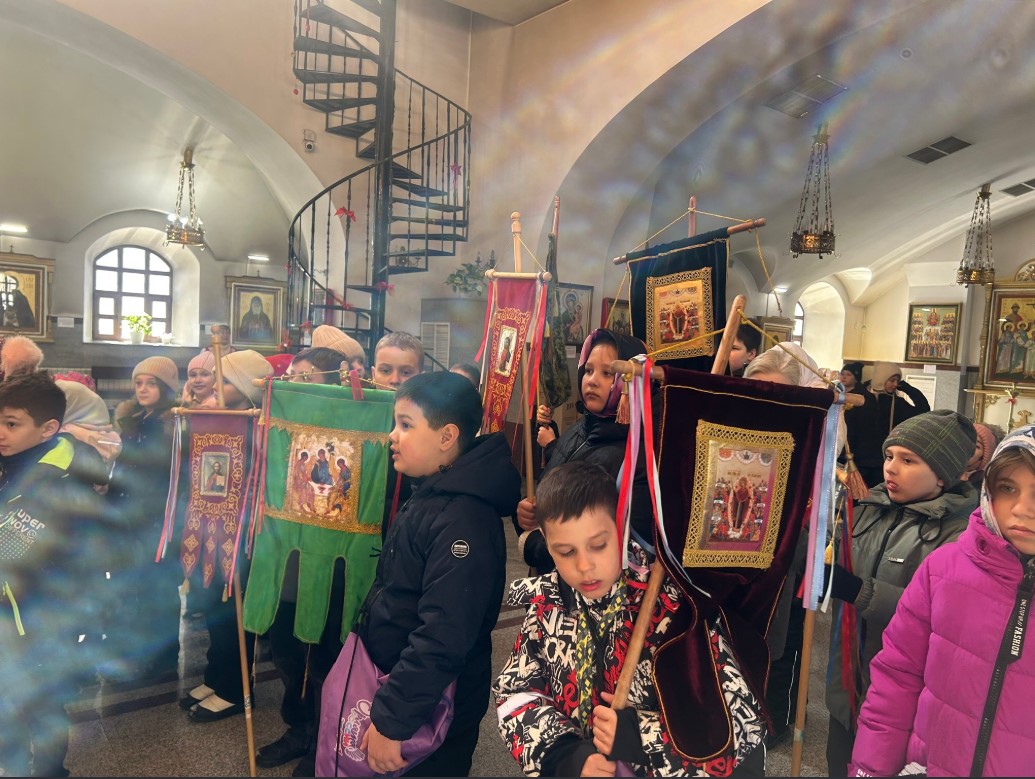 Отец Андрей провёл беседу с ребятами о празднике — Светлом Христовом Воскресении, его значении, истории, традициях. Далее школьникам было предложено пройти крестным ходом вокруг храма с хоругвями и пасхальными песнопениями.