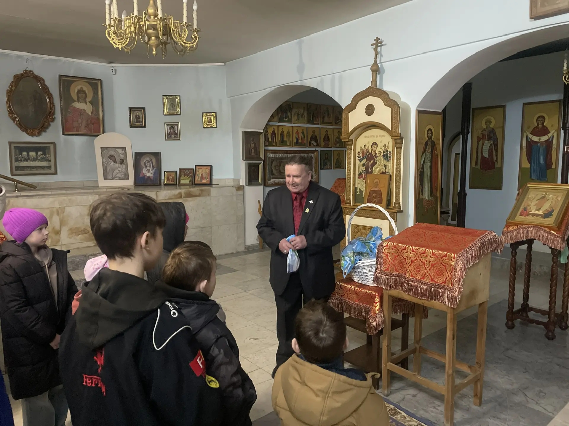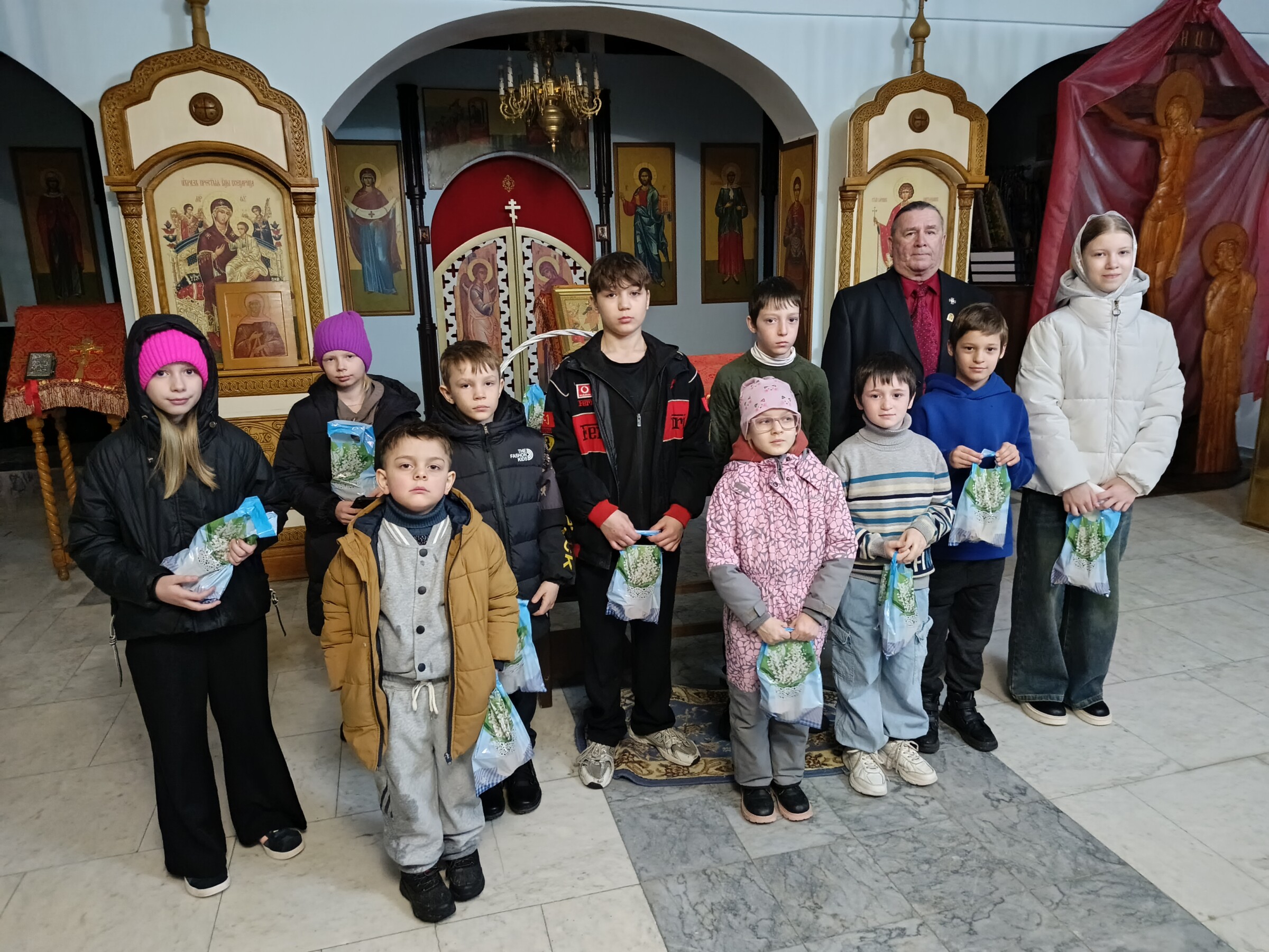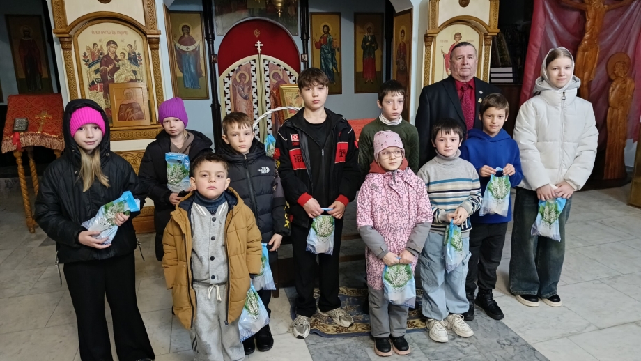 12 апреля 2026 года, по завершении детского Пасхального молебна, руководитель центра социальной адаптации имени преподобного Серафима Саровского Вольфсон Владимир Мануилович, совместно с сотрудниками «Комплексного центра социального обслуживания населения», встретились в нижнем предела храма в честь иконы Божией Матери «Всех скорбящих Радость» с детьми участников СВО и детьми из малообеспеченных семей.