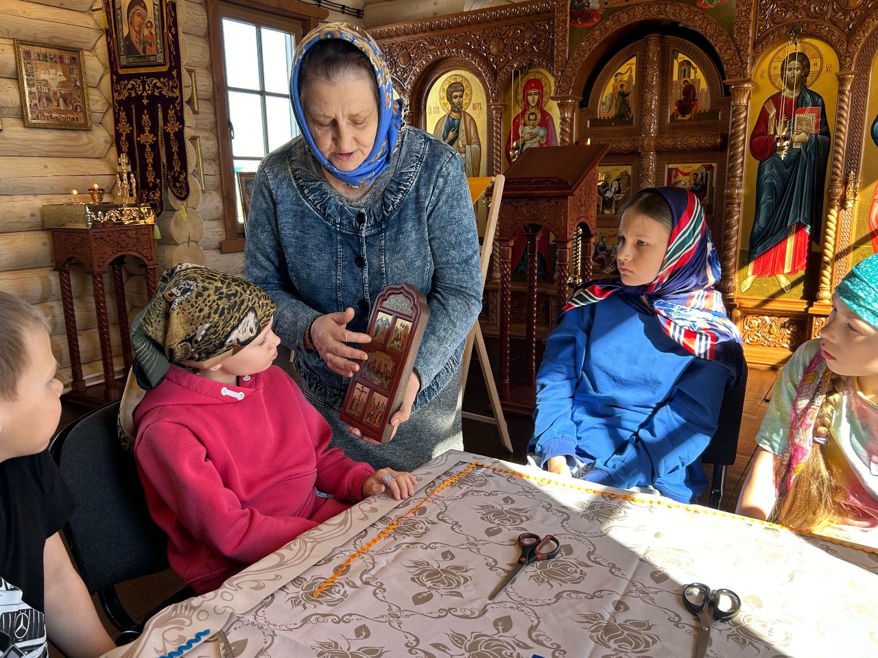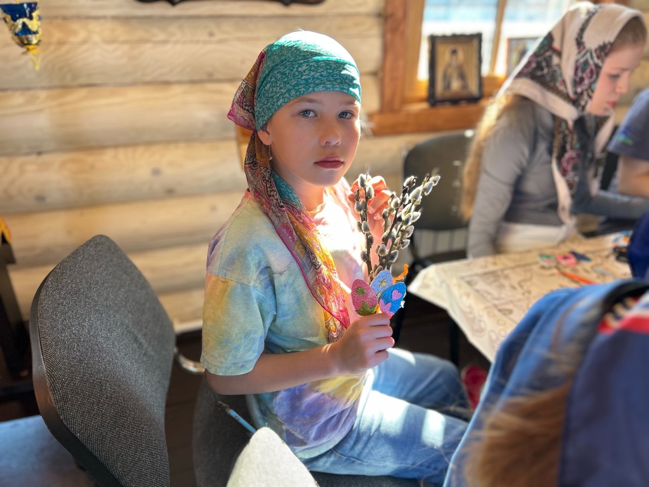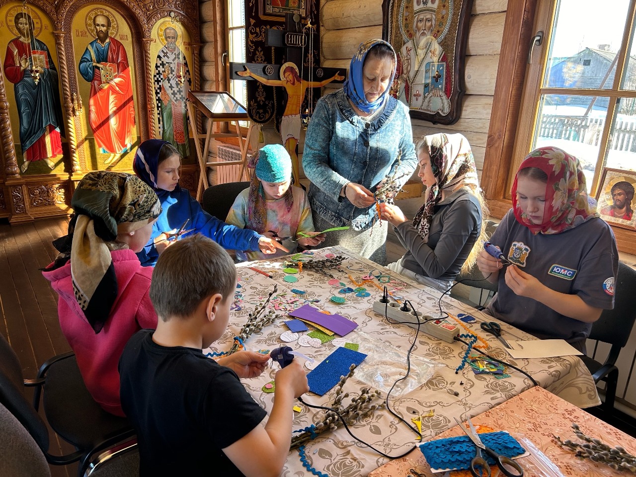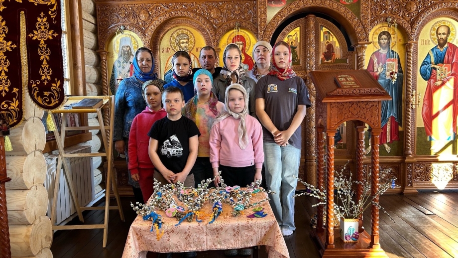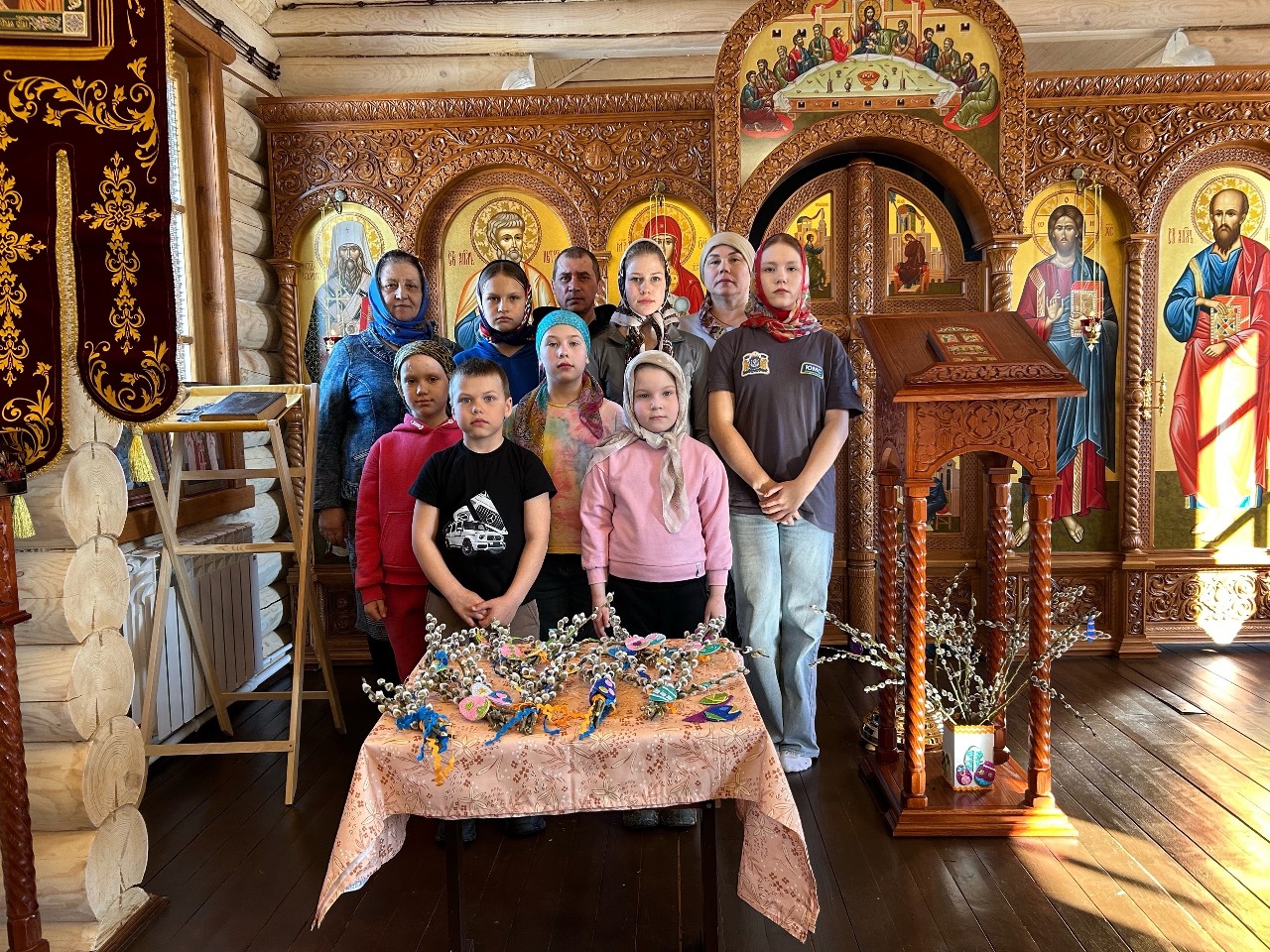 12 апреля на кануне Вербного Воскресения дети в деревне Согом собрали букеты верб в храме свт. Николая Чудотворца к предстоящему празднику.