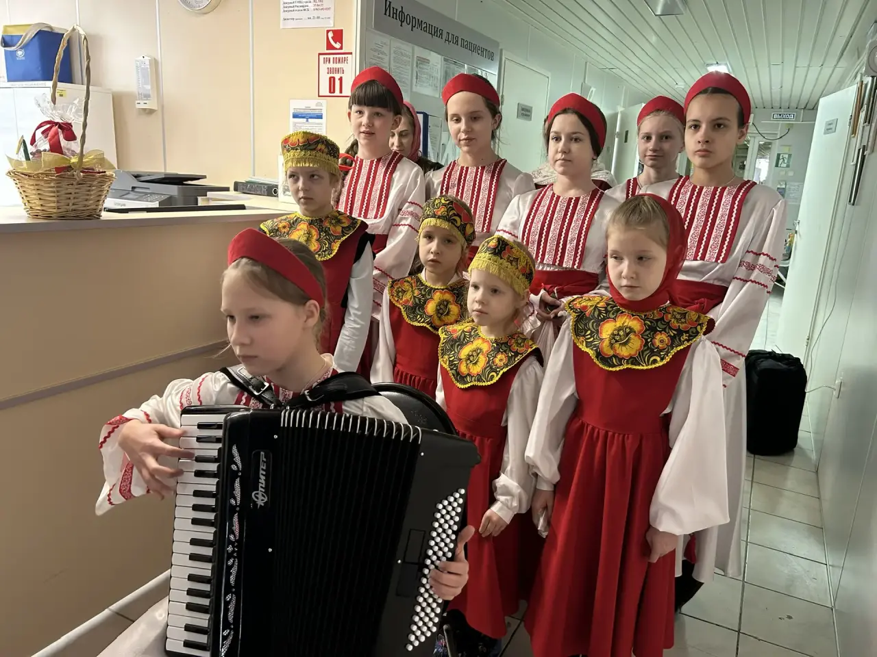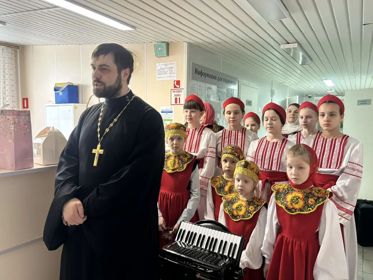 Гости побывали в двух хирургических отделениях для взрослых. Настоятель Прихода, иерей Андрей Плешков обратился к присутствующим с пастырским словом, раскрыв значение и смысл события Христова Воскресения. Юные воспитанники пропели тропарь Пасхи, а также исполнили стихи и пасхальные песни.