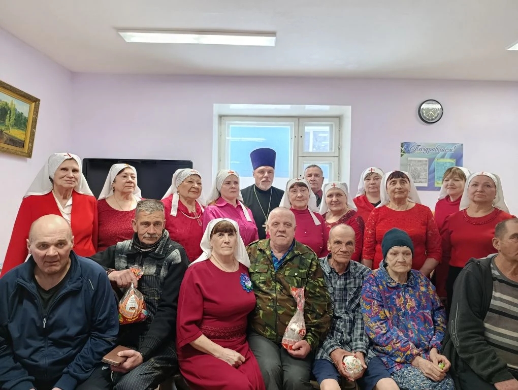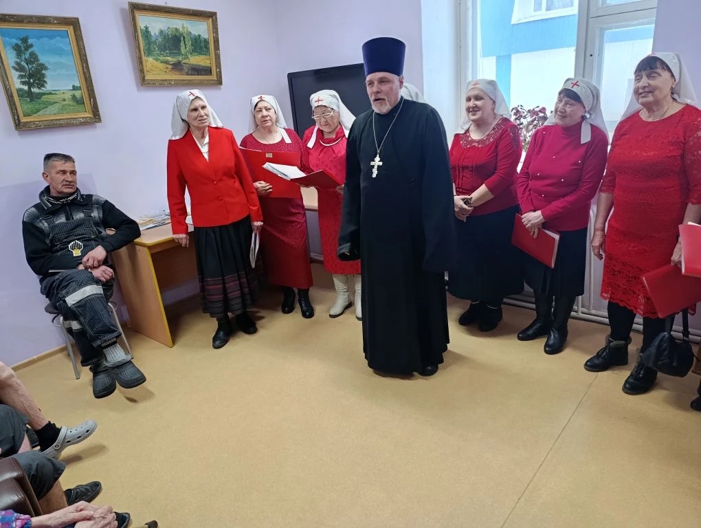 Отец Александр поздравил всех праздником Пасхи, а сестры милосердия спели пасхальные песнопения и вручили праздничные угощения подопечным.