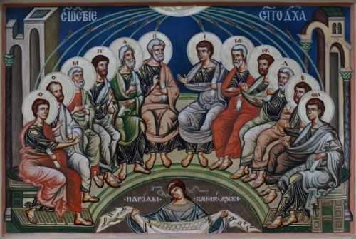 В десятый день по Вознесении Господа Иисуса Христа, в день иудейского праздника первой жатвы, когда ученики и с ними Дева Мария находились в Сионской горнице, в третий час дня в воздухе послышался сильный шум, как во время бури. В воздухе появились яркие трепещущие языки огня. Это был огонь не вещественный – он был одной природы с благодатным огнем, который ежегодно сходит в Иерусалиме на Пасху, он светил, не обжигая. Носясь над головами апостолов, языки огня опустились на них и остановились. Тут же, вместе с внешним явлением произошло и внутреннее преображение, совершившееся в душах: «исполнишася вси Духа Свята». И Богоматерь, и апостолы ощутили в тот миг необыкновенную силу, действующую в них. Просто и непосредственно им был дан свыше новый благодатный дар – они заговорили на языках, которых не знали прежде. Это было дарование, необходимое для проповеди Евангелия по всему миру.