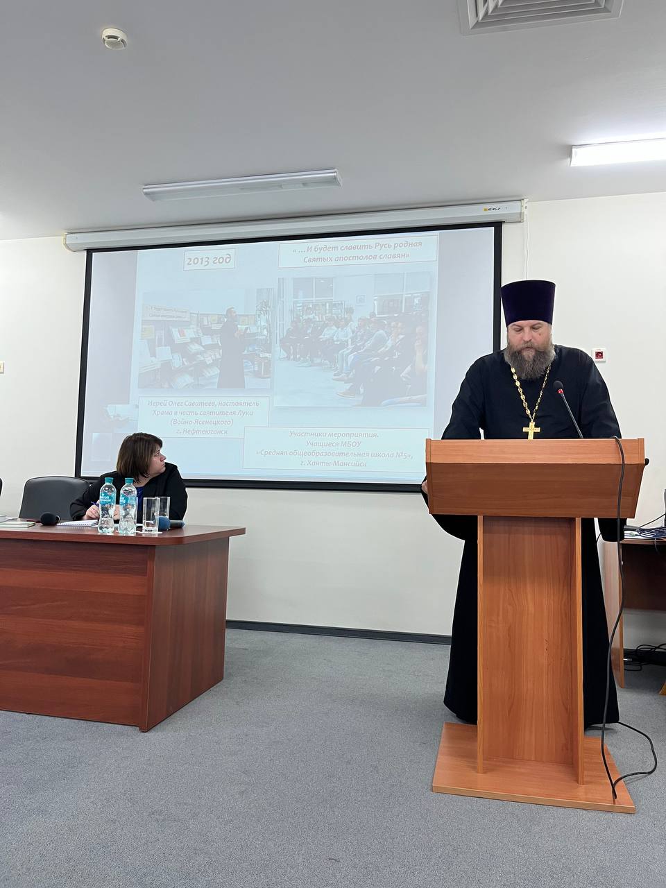 От лица Ханты-Мансийской митрополии с докладом на тему «Реализация проекта «Православная книга в библиотеке» помощник председателя отдела по взаимоотношениям Церкви с обществом и СМИ епархии иерей Тарасий Борозенец.