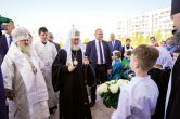 У входа в храм Предстоятеля Русской Православной Церкви встречали митрополит Ханты-Мансийский и Сургутский Павел, учащиеся православной гимназии во имя святителя Николая Чудотворца.