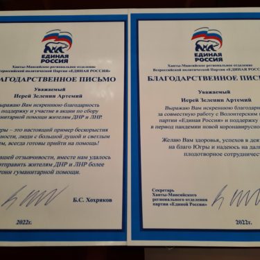 Приход храма в честь иконы Божией Матери «Нечаянная Радость» в лице настоятеля иерея Артемия Зеленина награжден Благодарственным письмом Ханты-Мансийского регионального отделения Всероссийской политической Партии «Единая Россия» за работу и поддержку в период новой коронавирусной инфекции. А также, Хохряков Борис Сергеевич Секретарь Ханты-Мансийского регионального отделения Партии «ЕДИНАЯ РОССИЯ» вручил Благодарственное письмо за поддержку и участие в акции по сбору гуманитарной помощи жителям ДНР и ЛНР.