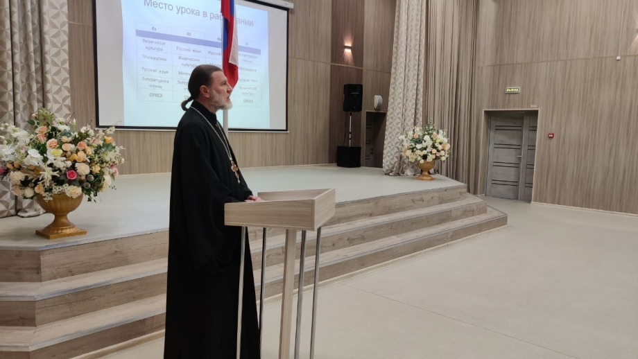 Отец Сергий в своем выступлении рассказал о важном значении изучения Основ православной культуры для школьников, живущих в России. История нашей страны, ее культура неразрывна связана с православной верой, которая является фундаментом духовно-нравственных традиций нашего народа.