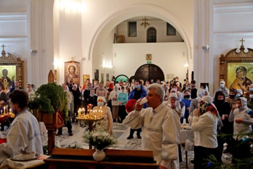 Соблюдая все предписания, храм заполнили семьи прихожан.