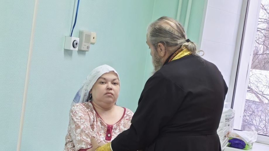 Священник и сестра милосердия окормляют больных отделений стационара горбольницы
