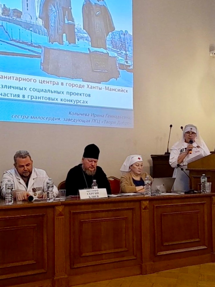 В роли спикера была приглашена заведующая Православным гуманитарным центром «Твори добро» Ирина Геннадьевна Колычева, которая выступила с докладом «Создание Православного гуманитарного Центра в городе Ханты-Мансийск. Реализация различных социальных проектов с помощью участия в грантовых конкурсах».