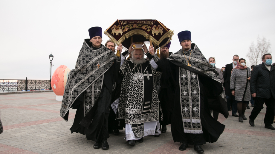 В Великую Пятницу Страстной седмицы, воспоминание Святых спасительных Страстей Господа нашего Иисуса Христа, митрополит Ханты-Мансийский и Сургутский Павел совершил вечерню с выносом Плащаницы Спасителя в Воскресенском кафедральном соборе г. Ханты-Мансийска
