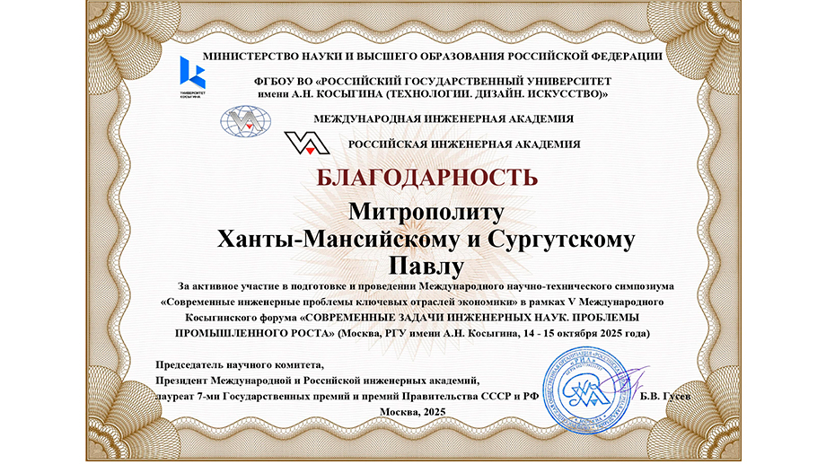 Министерство науки и высшего образования Российской Федерации, Международная инженерная академия и Российская инженерная академия вынесли Благодарность митрополиту Ханты-Мансийскому и Сургутскому Павлу за активное участие в подготовке и про...