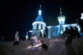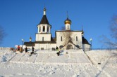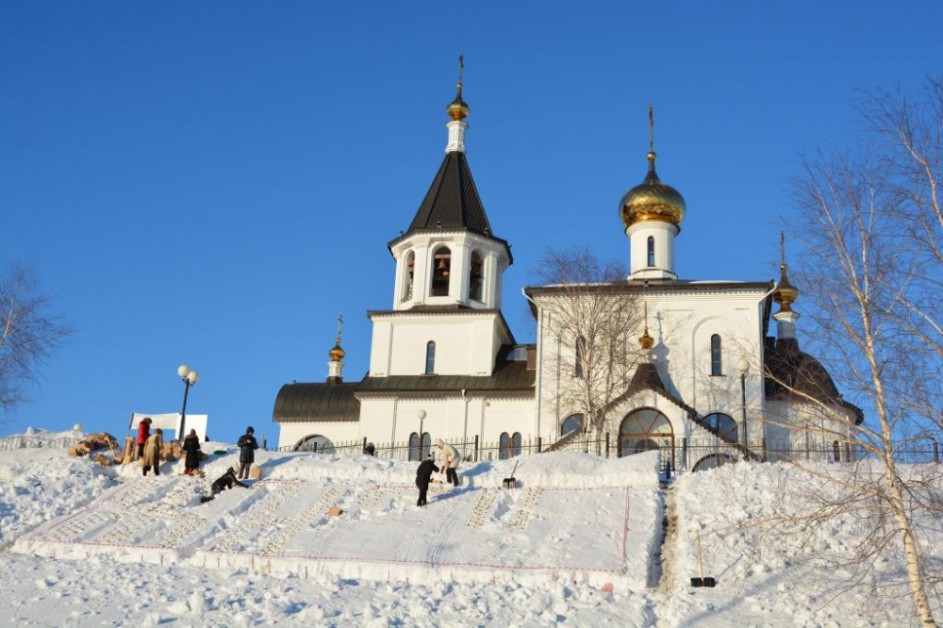 Под склоном, на фоне сияющей надписи, настоятелем прихода храма Святого Духа, протоиереем Николаем Матвийчук, был отслужен молебен в сослужении священнослужителей города, иерея Михаила Мелешкина, иерея Алексия Осипова, иерея Олега Саватеева, иерея Даниила Шумбасова