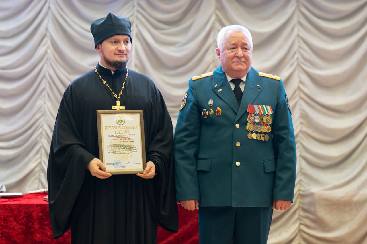 За многолетние труды по воспитанию сотрудников МЧС России иерей Дионисий Безносов был отмечен благодарственным письмом руководства ведомства.
