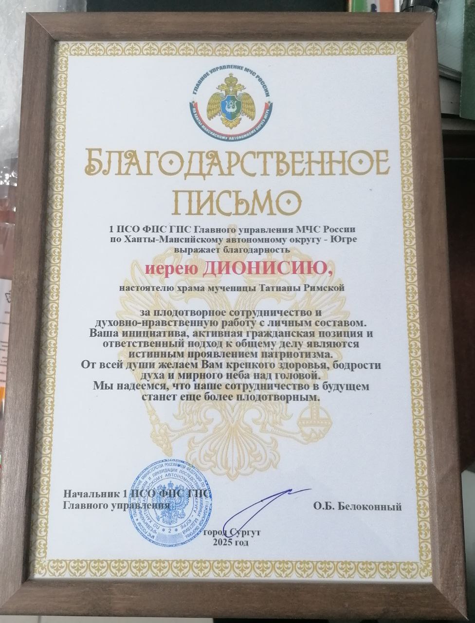 Священник отмечен благодарственным письмом МЧС России по ХМАО- Югре