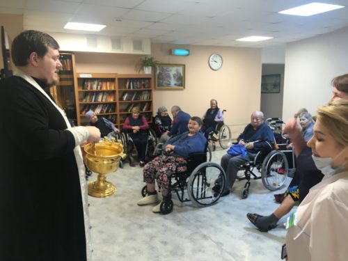 Батюшка познакомился с руководством учреждения и его постояльцами, окропил святой водой всех работников центра, а также комнаты проживающих в двух корпусах . Более ста человек проживают на данный момент в Геронтологическом центре , в тепле и заботе.
