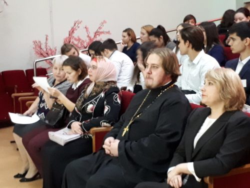 Настоятель Прихода храма в честь иконы Божией Матери «Нечаянная Радость» в городе Пыть-Яхе иерей Артемий Зеленин принял участие в мероприятии, организованном в общеобразовательной школе №5 «Пыть-Ях- многонациональный, уважение к друг другу». У каждого народа – свои обычаи, праздники, свои песни и сказки. В них отражается душа народа, уклад его жизни, любовь к труду и земле, почитание отцов и дедов. На примере казачества, учащиеся школы рассказали о любви казаков не только к своей огромной, необъятной Родине, а прежде всего к уважению ценностей своей малой Родины, где они родились и выросли. О любви к Богу и ближнему, о сострадании и товарищеской взаимопомощи, миролюбии и других добродетелях. Дети говорили о том, что в нашем многонациональном городе надо уважать других. Быть внимательными к другим и учиться понимать друг друга.