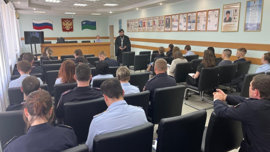 Иерей Федор Максимов, клирик храма Святого Духа города Нефтеюганска, провел беседу с сотрудниками отдела МВД по Нефтеюганскому району на тему «Вера как источник традиций обычаев и культуры народов России». В беседе приняли участие 30 сотрудников.
