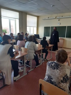 14 февраля настоятель храма иконы Божией Матери «Скоропослушница» п. Луговской иерей Александр Канаев провел встречу с педагогами школы. На встрече было рассказано о празднике Сретения Господня.