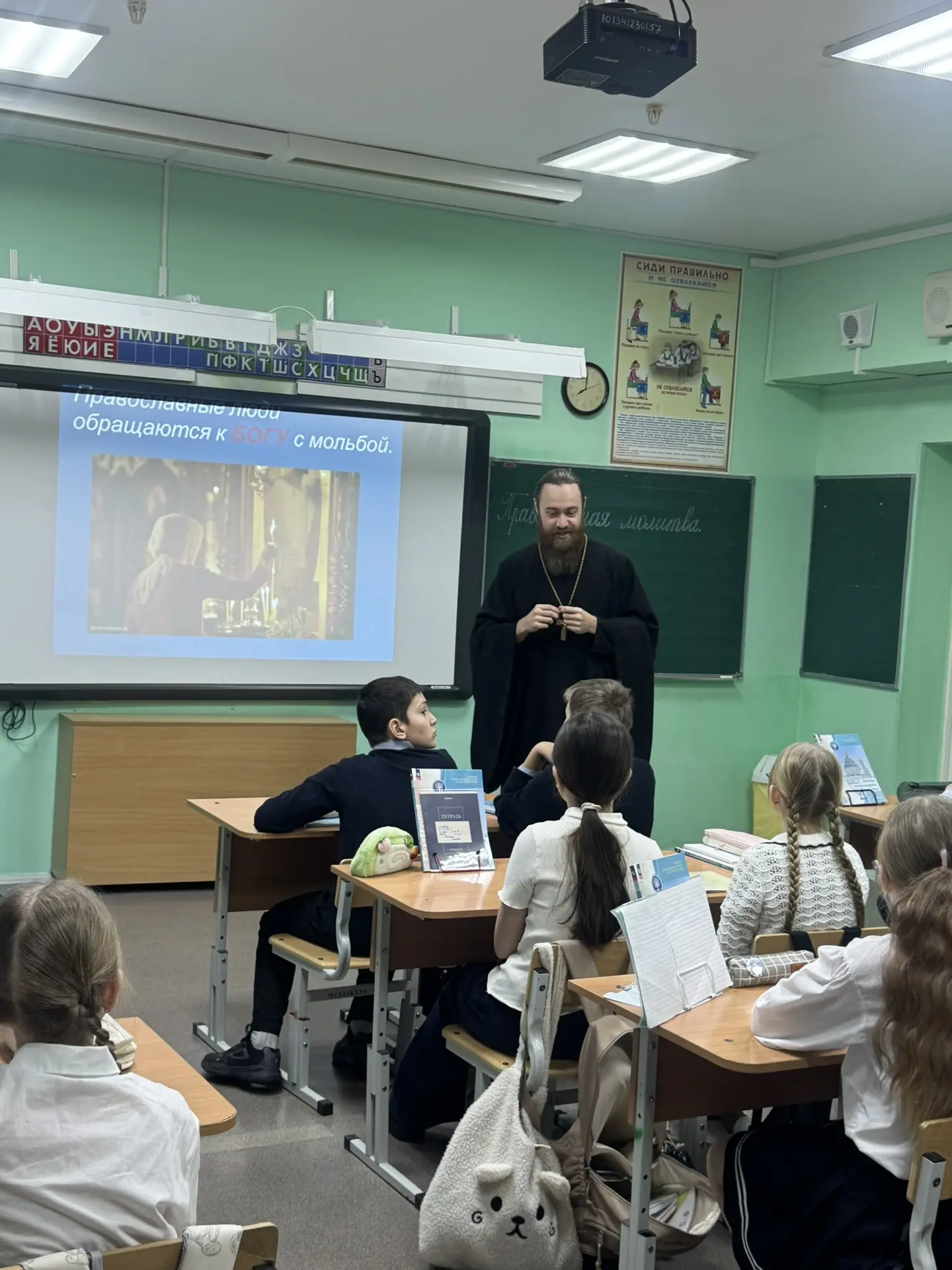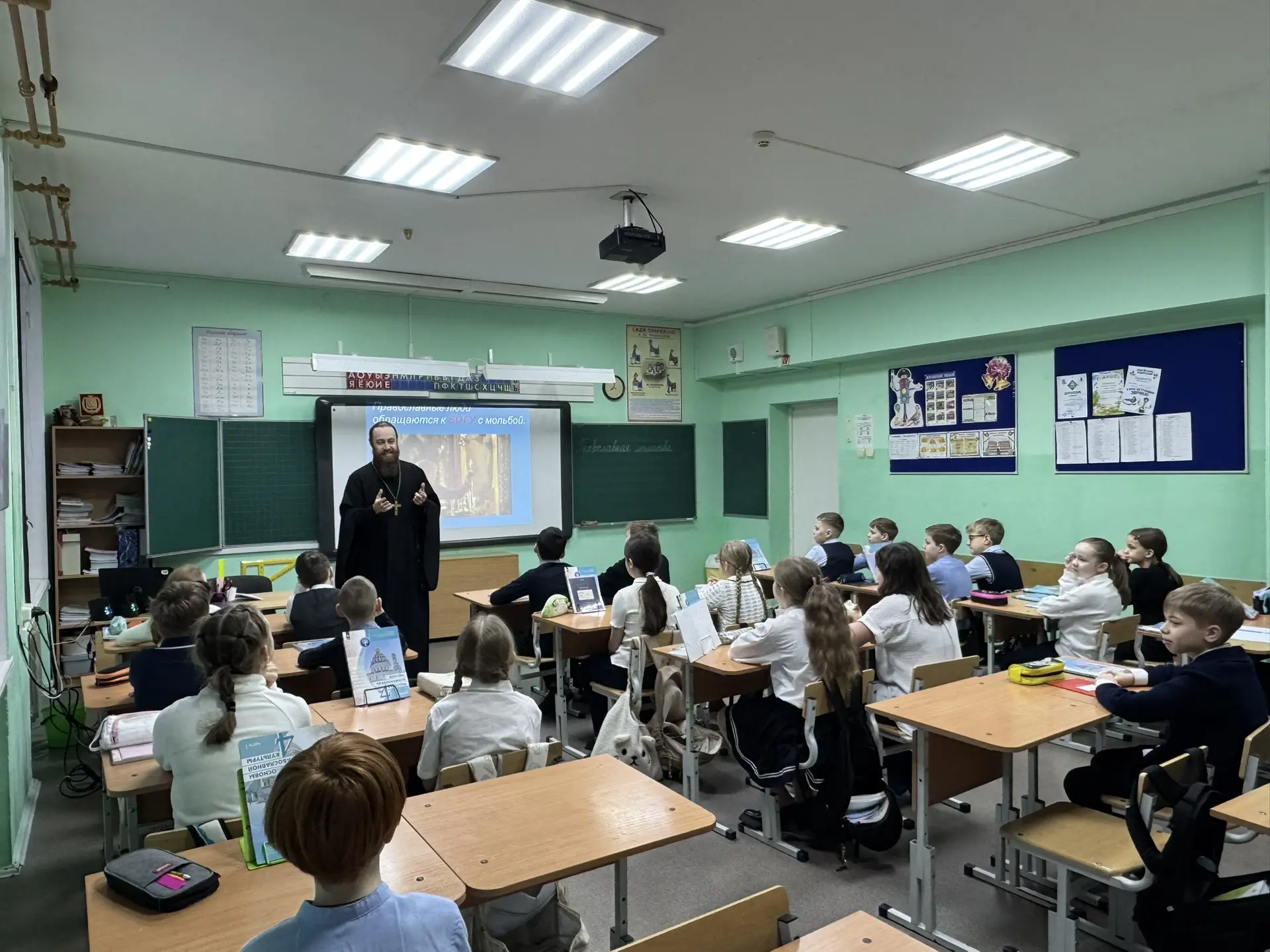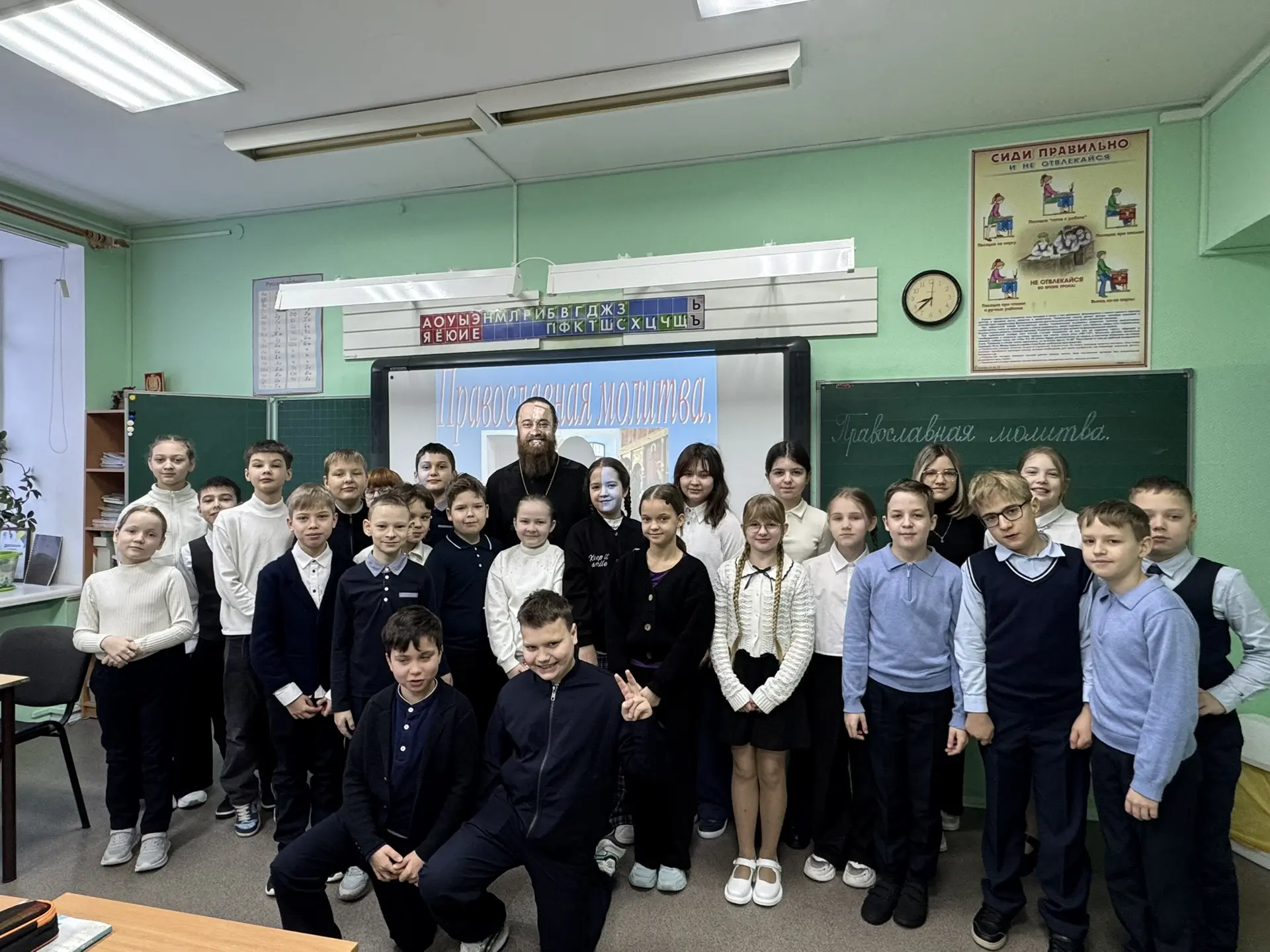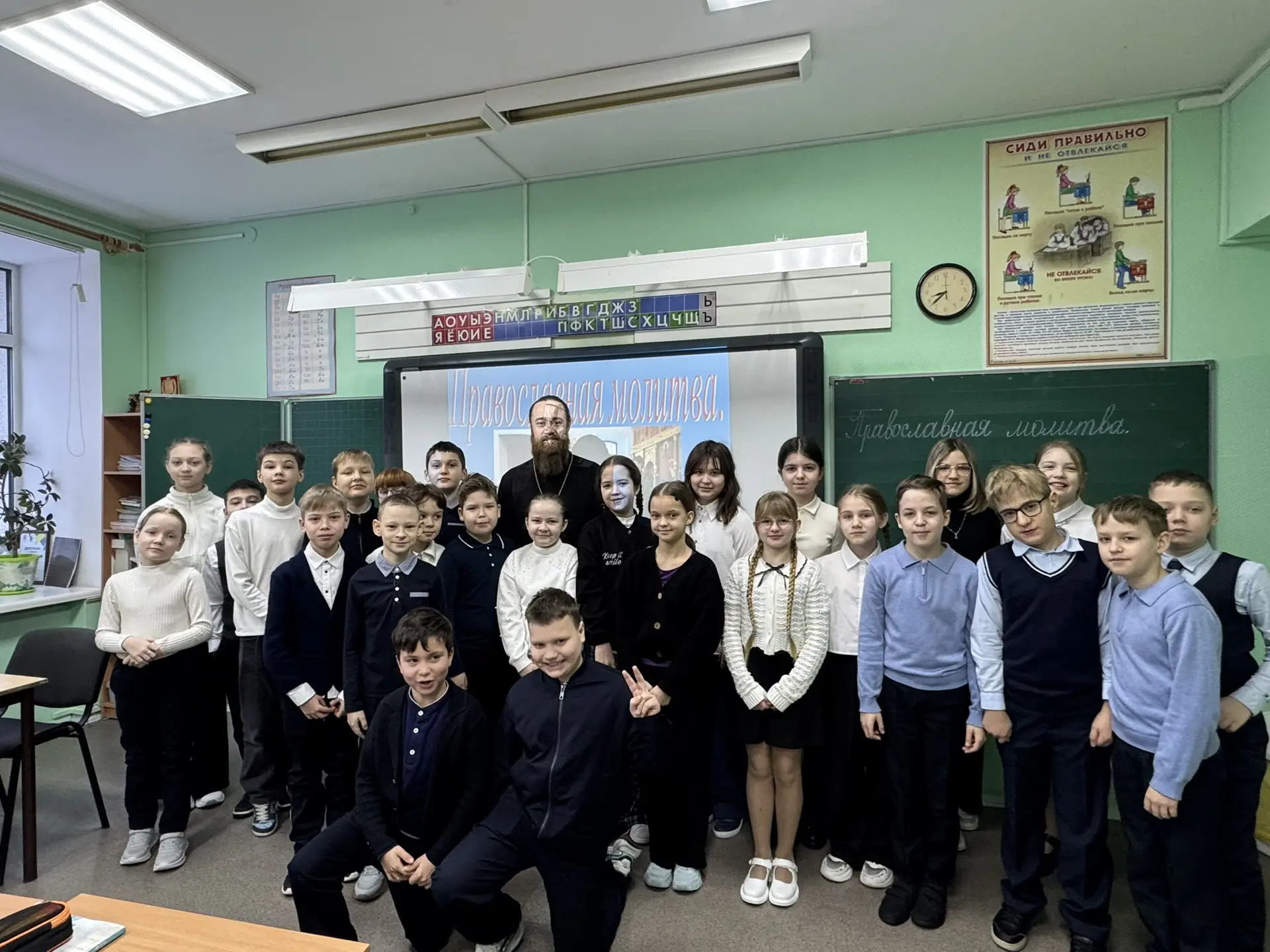 Тема урока – «Православная молитва». Современным детям важно понять разницу между материальным потреблением и духовной жизнью. Священник доступным языком объяснил школьникам, что молитва бывает просительной, благодарственной и покаянной. Встреча прошла в тёплой и доверительной атмосфере.