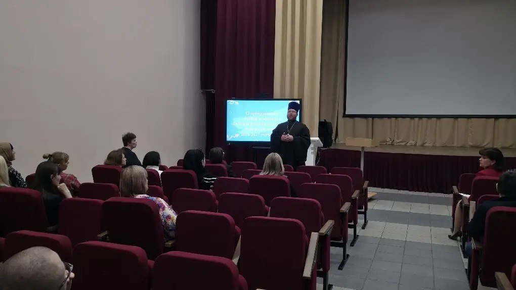 12 марта 2026 года клирик Собора Преображения Господня г. Сургута иерей Сергий Мартынюк в МБОУ СОШ №7 провел беседу с родителями учащихся 3 — х классов на тему » О выборе модуля ОРКСЭ»