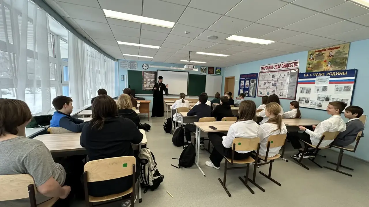 12 и 13 февраля 2026 года настоятель храма в честь пророка Божия Илии г. Ханты-Мансийска иерей Евгений Кизин встретился с учащимися 8-х классов МБОУ «СОШ № 1 им. Созонова Ю.Г.»