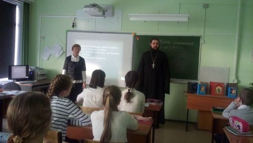 На урок были приглашены священник прихода храма в честь иконы Божией Матери «Всех скорбящих Радость» иерей Вячеслав Галицкий, заместитель директора по инновационной деятельности и учебно-воспитательной работе И.А.Билль, руководитель методического объединения учителей русского языка и литературы Н.В.Слита.